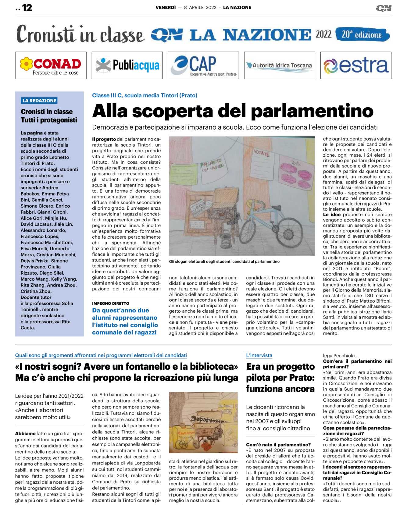 Il progetto del parlamentino caratterizza la scuola Tintori, un progetto originale che prende vita a Prato proprio nel nostro Istituto. Ma in cosa consiste? Consiste nell’organizzare un organismo di rappresentanza degli studenti all’interno della scuola, il parlamentino appunto. E’ una forma di democrazia rappresentativa ancora poco diffusa nelle scuole secondarie di primo grado. È un’esperienza che avvicina i ragazzi al concetto di «rappresentanza» ed all’impegno in prima linea. È inoltre un’esperienza molto formativa che fa crescere personalmente chi la sperimenta. Affinché l’azione del parlamentino sia efficace è importante che tutti gli studenti, anche i non eletti, partecipino attivamente, portando idee e contributi. Un valore aggiunto del progetto è che negli ultimi anni è cresciuta la partecipazione dei nostri compagni non italofoni: alcuni si sono candidati e sono stati eletti. Ma come funziona il parlamentino? All’inizio dell’anno scolastico, in ogni classe seconda e terza – un anno hanno partecipato al progetto anche le classi prime, ma l’esperienza non fu molto efficace e non fu ripetuta – viene presentato il progetto e chiesto agli studenti chi è disponibile a candidarsi. Trovati i candidati in ogni classe si procede con una reale elezione. Gli eletti devono essere quattro per classe, due maschi e due femmine, due delegati e due sostituti. Ogni ragazzo che decide di candidarsi, ha la possibilità di creare un proprio volantino per la «campagna elettorale». Tutti i volantini vengono esposti nell’agorà così che ogni studente possa valutare le proposte dei candidati e decidere chi votare. Dopo l’elezione, ogni mese, i 24 eletti, si ritrovano per parlare dei problemi della scuola e di nuove proposte. A partire da quest’anno, due alunni, un maschio e una femmina, scelti dai delegati di tutte le classi – elezioni di secondo livello – rappresentano il nostro istituto nel neonato consiglio comunale dei ragazzi di Prato insieme alle altre scuole.