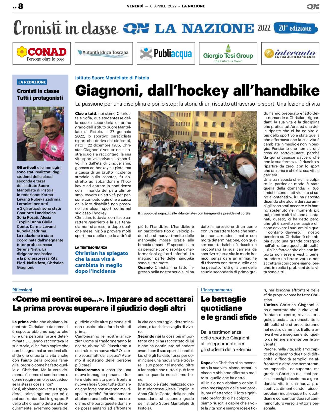 Ciao a tutti, noi siamo Charlotte e Sofia, due studentesse della scuola secondaria di primo grado dell’istituto Suore Mantellate di Pistoia. Il 27 gennaio 2022, lo sportivo paraciclista (sport che deriva dal ciclismo), nato il 22 dicembre 1975, Christan Giagnoni è venuto nella nostra scuola a raccontarci la sua vita sportiva e privata. Lo sportivo, fin dall’età di cinque anni, giocava ad hockey su pista, ma a causa di un brutto incidente stradale sullo scooter, fu costretto ad abbandonare l’hockey e ad entrare in confidenza con il mondo del para olimpismo, ovvero un’attività per persone con patologie che a causa della loro disabilità non possono fare alcuni sport, come nel suo caso l’hockey.