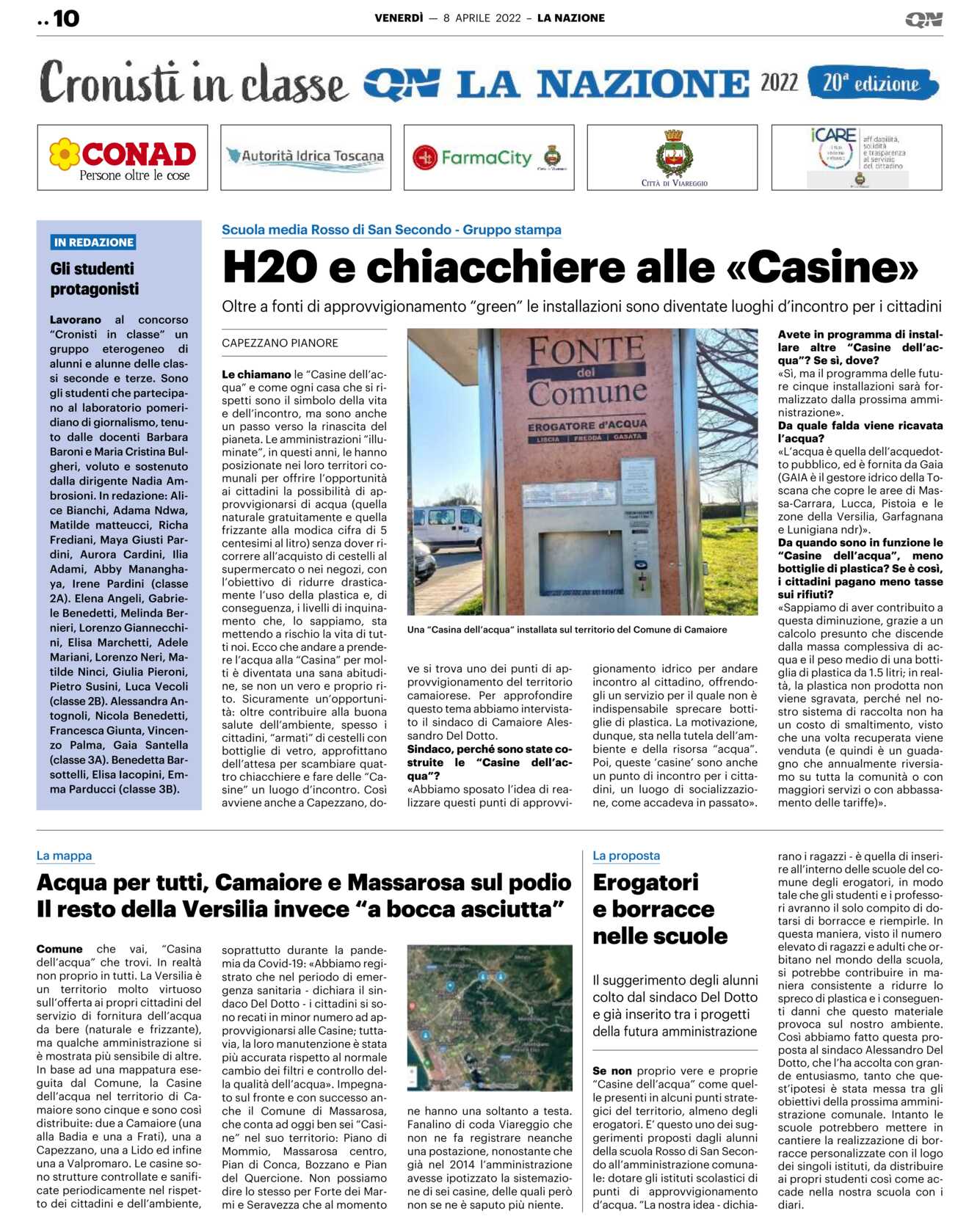 CAPEZZANO PIANORE Le chiamano le “Casine dell’acqua” e come ogni casa che si rispetti sono il simbolo della vita e dell’incontro, ma sono anche un passo verso la rinascita del pianeta. Le amministrazioni “illuminate”, in questi anni, le hanno posizionate nei loro territori comunali per offrire l’opportunità ai cittadini la possibilità di approvvigionarsi di acqua (quella naturale gratuitamente e quella frizzante alla modica cifra di 5 centesimi al litro) senza dover ricorrere all’acquisto di cestelli al supermercato o nei negozi, con l’obiettivo di ridurre drasticamente l’uso della plastica e, di conseguenza, i livelli di inquinamento che, lo sappiamo, sta mettendo a rischio la vita di tutti noi. Ecco che andare a prendere l’acqua alla “Casina” per molti è diventata una sana abitudine, se non un vero e proprio rito. Sicuramente un’opportunità: oltre contribuire alla buona salute dell’ambiente, spesso i cittadini, “armati” di cestelli con bottiglie di vetro, approfittano dell’attesa per scambiare quattro chiacchiere e fare delle “Casine” un luogo d’incontro. Così avviene anche a Capezzano, do-ve si trova uno dei punti di approvvigionamento del territorio camaiorese. Per approfondire questo tema abbiamo intervistato il sindaco di Camaiore Alessandro Del Dotto.