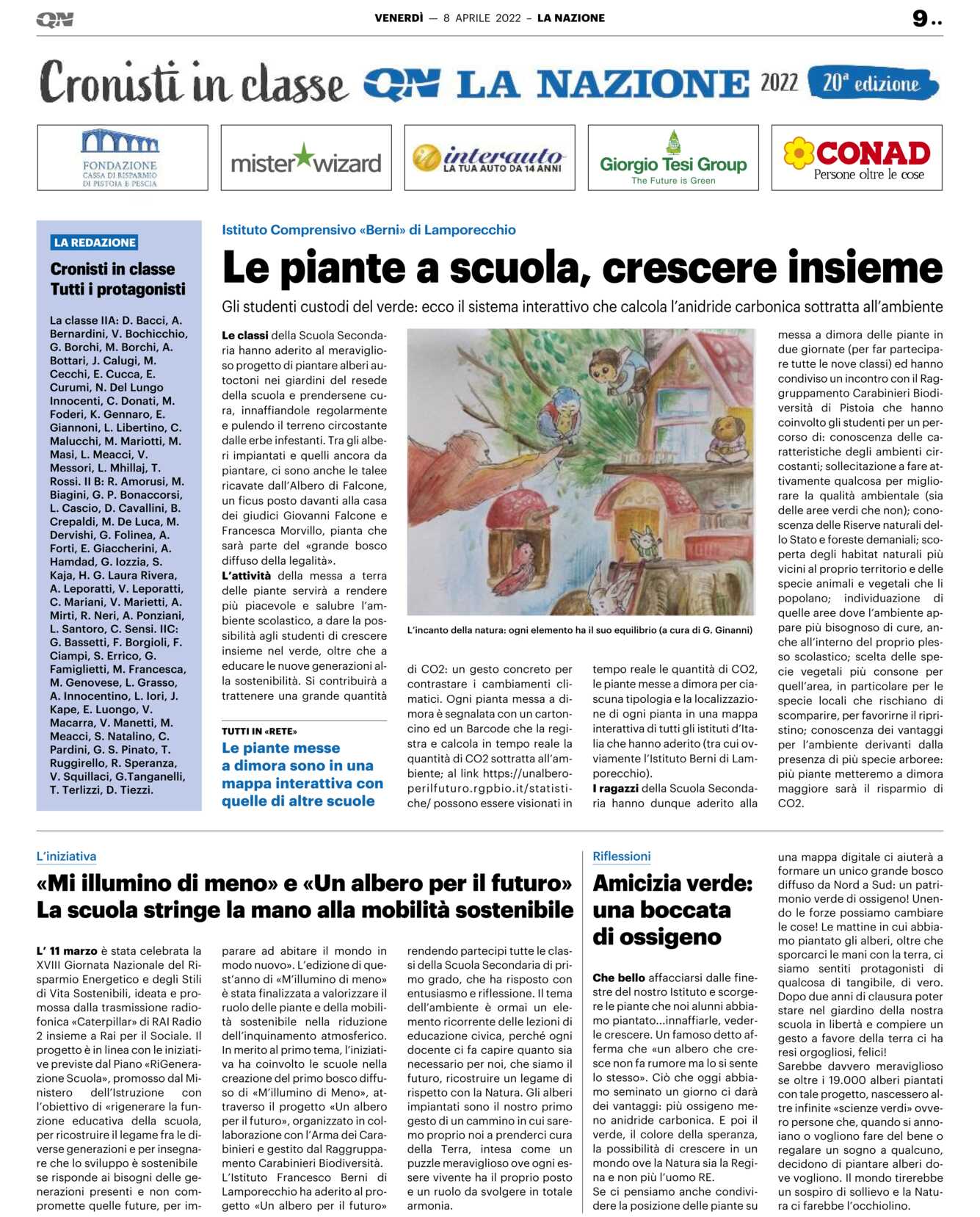 L’attività della messa a terra delle piante servirà a rendere più piacevole e salubre l’ambiente scolastico, a dare la possibilità agli studenti di crescere insieme nel verde, oltre che a educare le nuove generazioni alla sostenibilità. Si contribuirà a trattenere una grande quantità di CO2: un gesto concreto per contrastare i cambiamenti climatici. Ogni pianta messa a dimora è segnalata con un cartoncino ed un Barcode che la registra e calcola in tempo reale la quantità di CO2 sottratta all’ambiente; al link https://unalberoperilfuturo.rgpbio.it/statistiche/ possono essere visionati in tempo reale le quantità di CO2, le piante messe a dimora per ciascuna tipologia e la localizzazione di ogni pianta in una mappa interattiva di tutti gli istituti d’Italia che hanno aderito (tra cui ovviamente l’Istituto Berni di Lamporecchio).