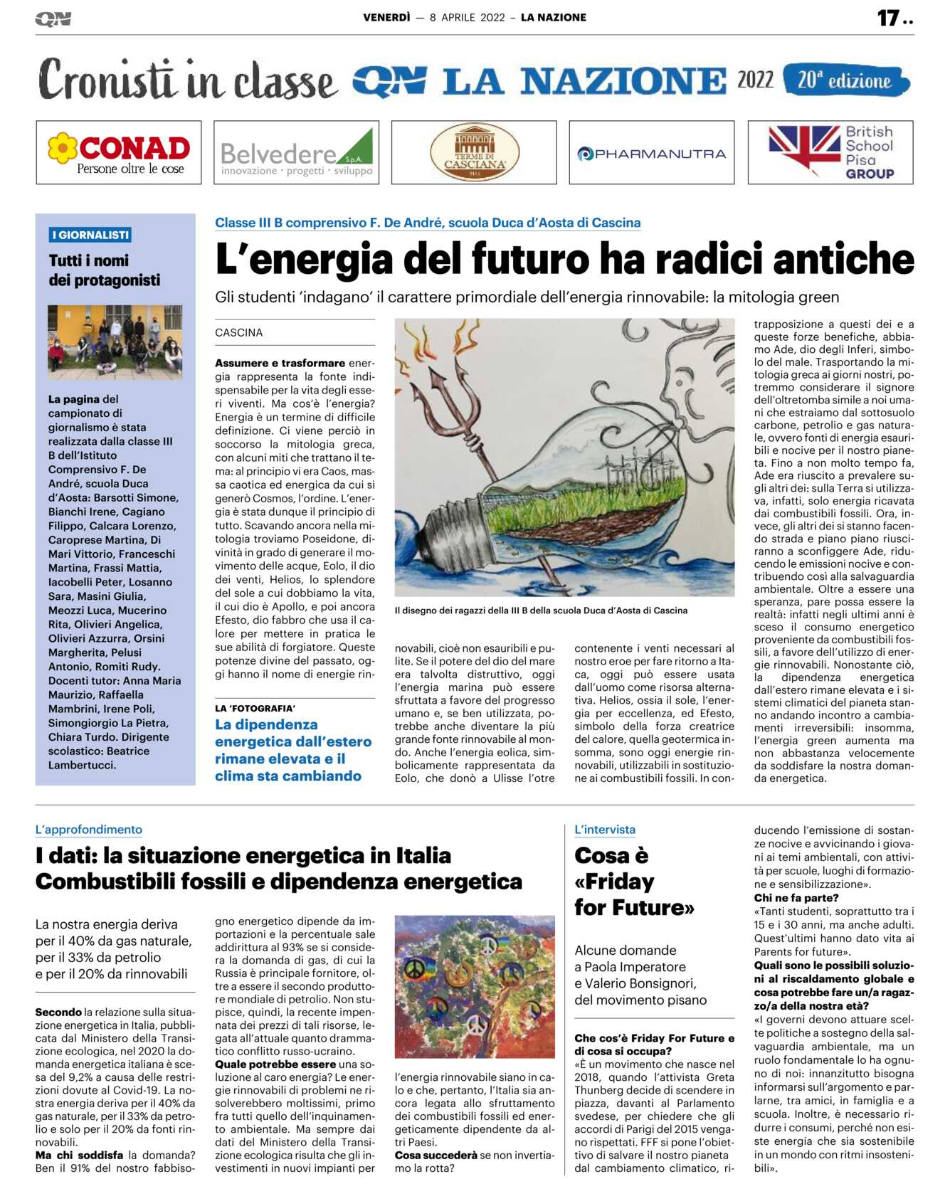 CASCINA Assumere e trasformare energia rappresenta la fonte indispensabile per la vita degli esseri viventi. Ma cos’è l’energia? Energia è un termine di difficile definizione. Ci viene perciò in soccorso la mitologia greca, con alcuni miti che trattano il tema: al principio vi era Caos, massa caotica ed energica da cui si generò Cosmos, l’ordine. L’energia è stata dunque il principio di tutto. Scavando ancora nella mitologia troviamo Poseidone, divinità in grado di generare il movimento delle acque, Eolo, il dio dei venti, Helios, lo splendore del sole a cui dobbiamo la vita, il cui dio è Apollo, e poi ancora Efesto, dio fabbro che usa il calore per mettere in pratica le sue abilità di forgiatore. Queste potenze divine del passato, oggi hanno il nome di energie rinnovabili, cioè non esauribili e pulite. Se il potere del dio del mare era talvolta distruttivo, oggi l’energia marina può essere sfruttata a favore del progresso umano e, se ben utilizzata, potrebbe anche diventare la più grande fonte rinnovabile al mondo. Anche l’energia eolica, simbolicamente rappresentata da Eolo, che donò a Ulisse l’otre contenente i venti necessari al nostro eroe per fare ritorno a Itaca, oggi può essere usata dall’uomo come risorsa alternativa. Helios, ossia il sole, l’energia per eccellenza, ed Efesto, simbolo della forza creatrice del calore, quella geotermica insomma, sono oggi energie rinnovabili, utilizzabili in sostituzione ai combustibili fossili. In contrapposizione a questi dei e a queste forze benefiche, abbiamo Ade, dio degli Inferi, simbolo del male. Trasportando la mitologia greca ai giorni nostri, potremmo considerare il signore dell’oltretomba simile a noi umani che estraiamo dal sottosuolo carbone, petrolio e gas naturale, ovvero fonti di energia esauribili e nocive per il nostro pianeta. Fino a non molto tempo fa, Ade era riuscito a prevalere sugli altri dei: sulla Terra si utilizzava, infatti, solo energia ricavata dai combustibili fossili. Ora, invece, gli altri dei si stanno facendo strada e piano piano riusciranno a sconfiggere Ade, riducendo le emissioni nocive e contribuendo così alla salvaguardia ambientale. Oltre a essere una speranza, pare possa essere la realtà: infatti negli ultimi anni è sceso il consumo energetico proveniente da combustibili fossili, a favore dell’utilizzo di energie rinnovabili. Nonostante ciò, la dipendenza energetica dall’estero rimane elevata e i sistemi climatici del pianeta stanno andando incontro a cambiamenti irreversibili: insomma, l’energia green aumenta ma non abbastanza velocemente da soddisfare la nostra domanda energetica.