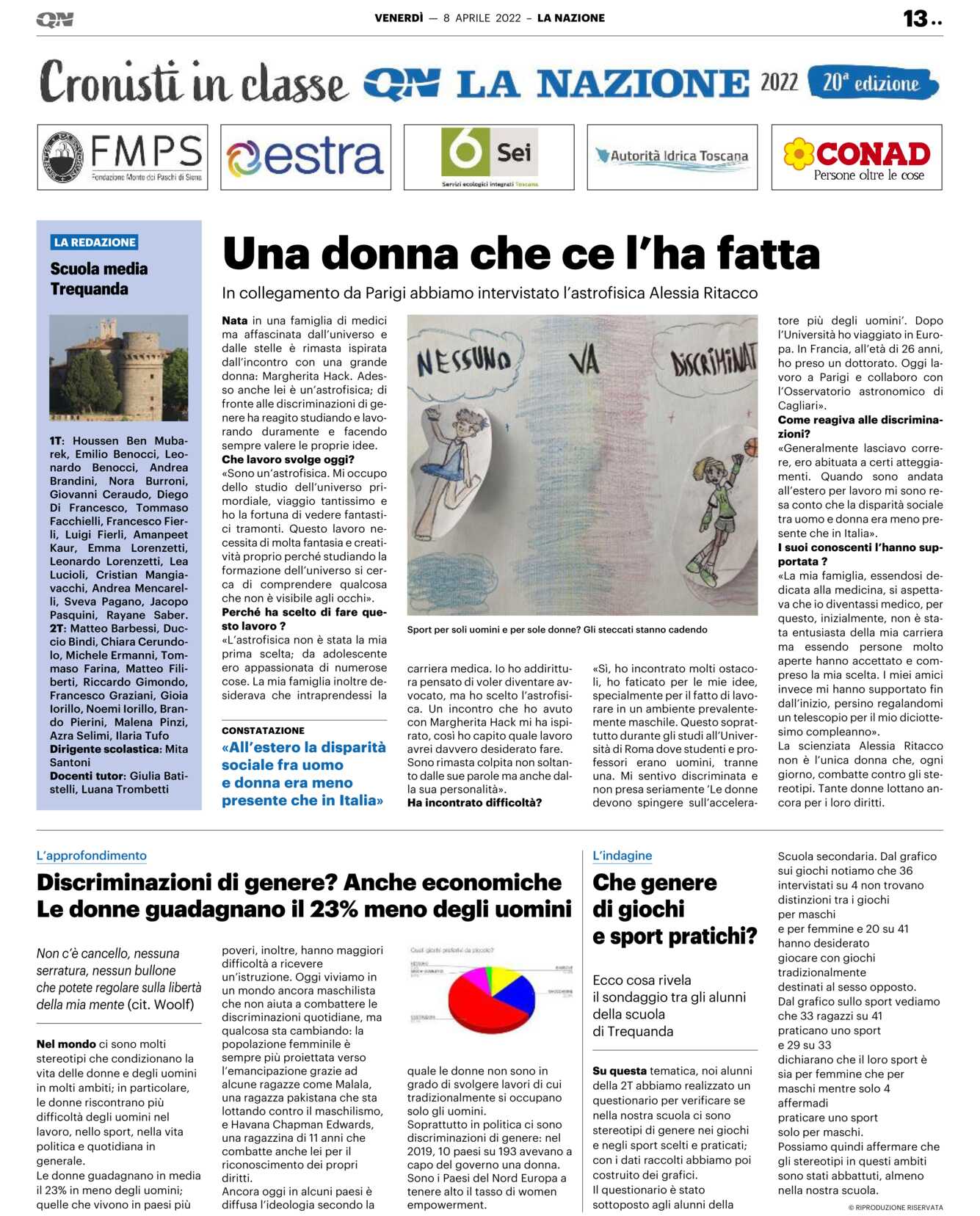 Ha incontrato difficoltà? «Sì, ho incontrato molti ostacoli, ho faticato per le mie idee, specialmente per il fatto di lavorare in un ambiente prevalentemente maschile. Questo soprattutto durante gli studi all’Università di Roma dove studenti e professori erano uomini, tranne una. Mi sentivo discriminata e non presa seriamente ’Le donne devono spingere sull’acceleratore più degli uomini’. Dopo l’Università ho viaggiato in Europa. In Francia, all’età di 26 anni, ho preso un dottorato. Oggi lavoro a Parigi e collaboro con l’Osservatorio astronomico di Cagliari».