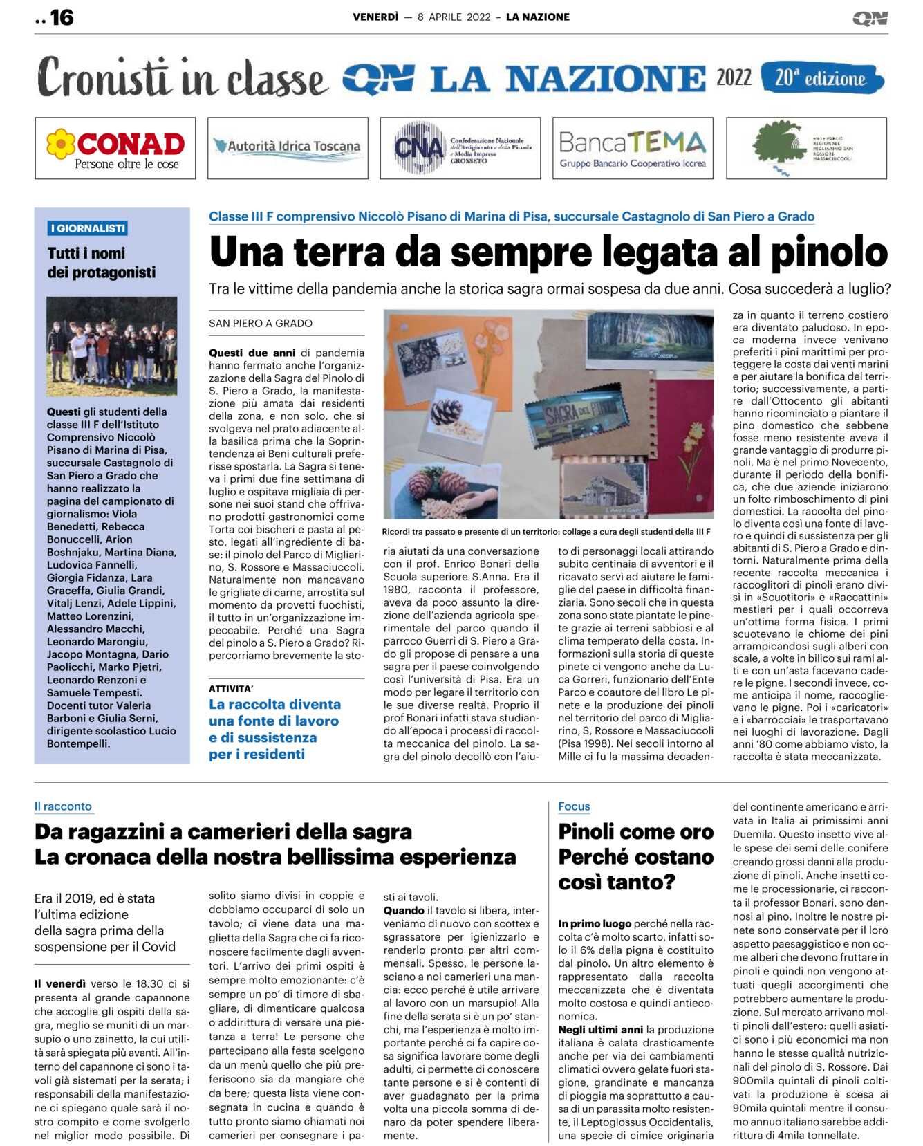 SAN PIERO A GRADO Questi due anni di pandemia hanno fermato anche l’organizzazione della Sagra del Pinolo di S. Piero a Grado, la manifestazione più amata dai residenti della zona, e non solo, che si svolgeva nel prato adiacente alla basilica prima che la Soprintendenza ai Beni culturali preferisse spostarla. La Sagra si teneva i primi due fine settimana di luglio e ospitava migliaia di persone nei suoi stand che offrivano prodotti gastronomici come Torta coi bischeri e pasta al pesto, legati all’ingrediente di base: il pinolo del Parco di Migliarino, S. Rossore e Massaciuccoli.