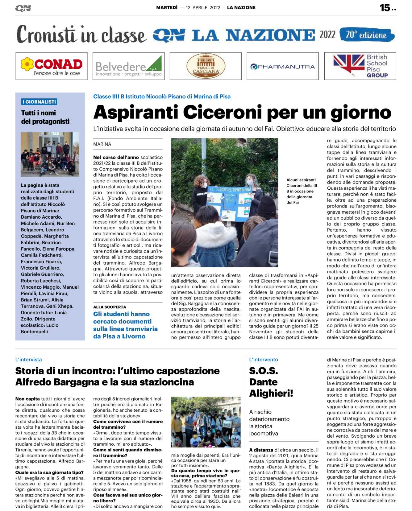 MARINA Nel corso dell’anno scolastico 2021/22 la classe III B dell’Istituto Comprensivo Niccolò Pisano di Marina di Pisa, ha colto l’occasione di partecipare ad un progetto relativo allo studio del proprio territorio, proposto dal F.A.I. (Fondo Ambiente Italiano). Si è così potuto svolgere un percorso formativo sul Trammino di Marina di Pisa, che ha permesso non solo di acquisire informazioni sulla storia della linea tramviaria da Pisa a Livorno attraverso lo studio di documenti fotografici e articoli, ma ricavare notizie e curiosità da un’intervista all’ultimo capostazione del trammino, Alfredo Bargagna. Attraverso questo progetto gli alunni hanno avuto la possibilità così di scoprire le particolarità della stazioncina, situata vicino alla scuola, attraverso un’attenta osservazione diretta dell’edificio, su cui prima lo sguardo cadeva solo occasionalmente. L’ascolto di una fonte orale così preziosa come quella del Sig. Bargagna e la conoscenza approfondita della nascita, evoluzione e cessazione del servizio tramviario, la storia e l’architettura dei principali edifici ancora presenti nel litorale, hanno permesso all’intero gruppo classe di trasformarsi in «Aspiranti Ciceroni» e realizzare cartelloni rappresentativi, per condividere la propria esperienza con le persone interessate all’argomento e alle novità nelle giornate organizzate dal FAI in autunno e in primavera. Ma come si sono sentiti gli alunni diventando guide per un giorno? Il 25 Novembre gli studenti della classe III B sono potuti diventa-re guide, accompagnando le classi dell’Istituto, lungo alcune tappe della linea tramviaria e fornendo agli interessati informazioni sulla storia e la cultura del trammino, descrivendo i punti in vari passaggi e rispondendo alle domande proposte.