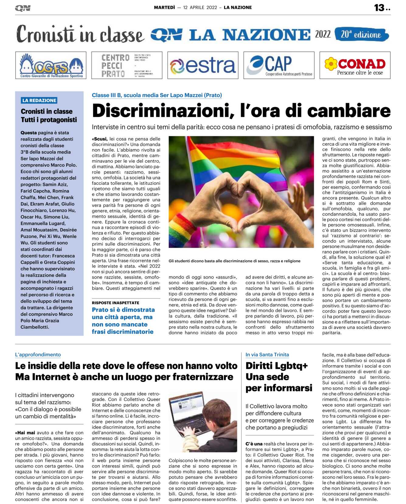 «Scusi, lei cosa ne pensa delle discriminazioni?» Una domanda non facile. L’abbiamo rivolta ai cittadini di Prato, mentre camminavano per le vie del centro, di mattina. Abbiamo lanciato parole pesanti: razzismo, sessismo, omofobia. La società ha una facciata tollerante, le istituzioni ripetono che siamo tutti uguali e che stiamo lavorando costantemente per raggiungere una vera parità fra persone di ogni genere, etnia, religione, orientamento sessuale, identità di genere. Eppure la cronaca continua a raccontare episodi di violenza e rifiuto. Per questo abbiamo deciso di interrogarci per primi sulle discriminazioni. Per la maggior parte, ci è parso che Prato si sia dimostrata una città aperta. Una frase ricorrente nelle interviste è stata. «Nel 2022 non si può ancora sentire di persone razziste, sessiste, omofobe». Insomma, è tempo di cambiare. Questi atteggiamenti nel mondo di oggi sono «assurdi», sono «idee antiquate che dovrebbero sparire». Questo è un tipo di commento che abbiamo ricevuto da persone di ogni genere, etnia ed età. Da dove vengono queste idee negative? Dalla cultura, dalla tradizione. «Il sessismo esiste perché è sempre stato nella nostra cultura, le donne hanno iniziato da poco ad avere dei diritti, e alcune ancora non li hanno». La discriminazione ha vari livelli: si parte da una parola di troppo detta a scuola, si va avanti fino a esclusioni molto dannose, come quelle nel mondo del lavoro. E sempre parlando di lavoro, più persone hanno espresso rabbia nei confronti dello sfruttamento messo in atto verso troppi migranti, che vengono in Italia in cerca di una vita migliore e invece finiscono nella rete dello sfruttamento. Le risposte negative ci sono state, purtroppo senza molte giustificazioni. Abbiamo assistito a un’esternazione profondamente razzista nei confronti dei popoli Rom e Sinti, per esempio, confermando così che l’antitziganismo in Italia è ancora presente. Qualcun altro si è sottratto alle domande sull’omofobia, qualcuno, pur condannandola, ha usato parole poco cortesi nei confronti delle persone omosessuali. Infine, c’è stato un bizzarro intervento sul ’razzismo al contrario’: secondo un intervistato, alcune persone musulmane non desiderano parlare con i cristiani. Quindi, alla fine, la soluzione qual è? «Serve tanta educazione, a scuola, in famiglia e fra gli amici». La scuola è al centro: bisogna parlare di questi problemi, capirli e imparare ad affrontarli.