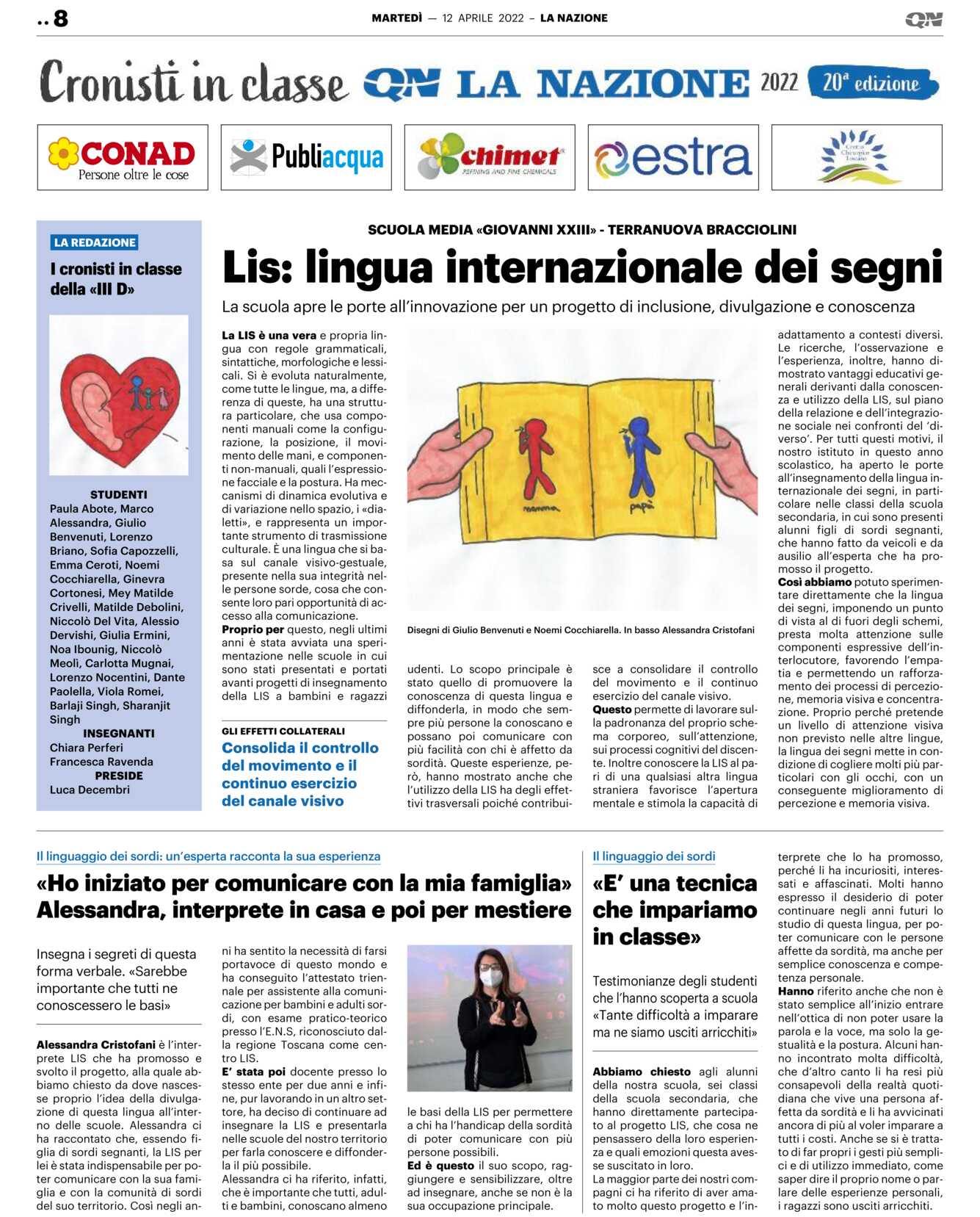 Le ricerche, l’osservazione e l’esperienza, inoltre, hanno dimostrato vantaggi educativi generali derivanti dalla conoscenza e utilizzo della LIS, sul piano della relazione e dell’integrazione sociale nei confronti del ‘diverso’. Per tutti questi motivi, il nostro istituto in questo anno scolastico, ha aperto le porte all’insegnamento della lingua internazionale dei segni, in particolare nelle classi della scuola secondaria, in cui sono presenti alunni figli di sordi segnanti, che hanno fatto da veicoli e da ausilio all’esperta che ha promosso il progetto.
