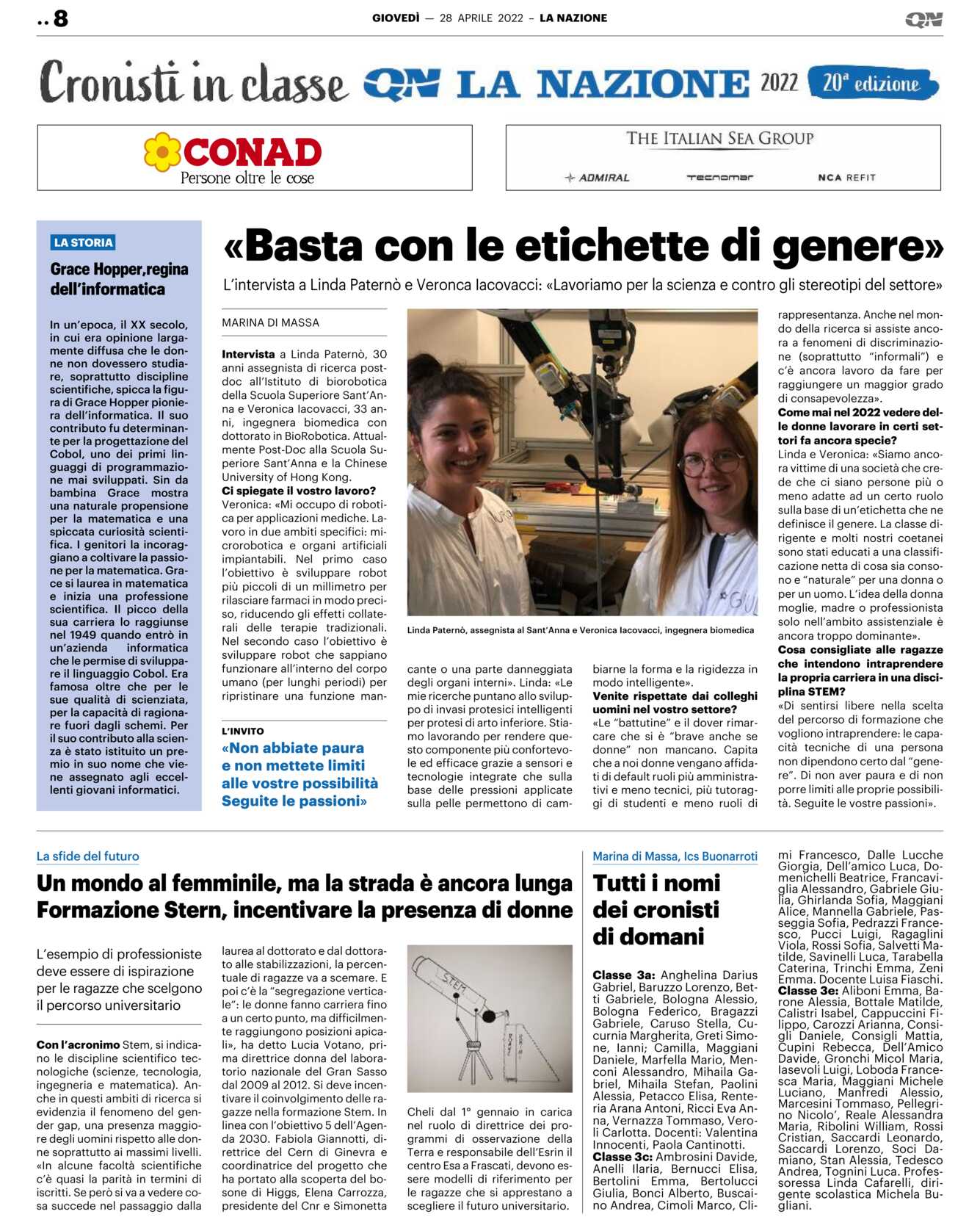 MARINA DI MASSA Intervista a Linda Paternò, 30 anni assegnista di ricerca postdoc all’Istituto di biorobotica della Scuola Superiore Sant’Anna e Veronica Iacovacci, 33 anni, ingegnera biomedica con dottorato in BioRobotica. Attualmente Post-Doc alla Scuola Superiore Sant’Anna e la Chinese University of Hong Kong.