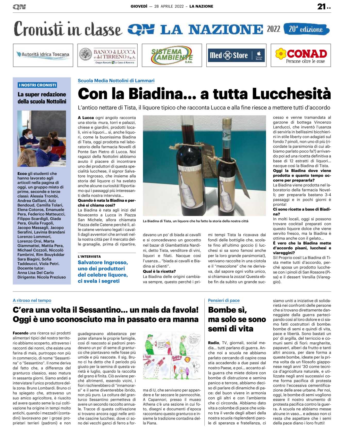 A Lucca ogni angolo racconta una storia: mura, torri e palazzi, chiese e giardini, prodotti locali, vini e liquori… sì, anche liquori, come la buonissima Biadina di Tista, oggi prodotta nel laboratorio della farmacia Novelli di Ponte San Pietro di Lucca. Noi ragazzi della Nottolini abbiamo avuto il piacere di incontrare uno dei produttori di questa specialità lucchese, il signor Salvatore Ingrosso, che insieme alla storia del liquore ci ha svelato anche alcune curiosità! Riportiamo qui i passaggi più interessanti della nostra intervista… Quando è nata la Biadina e perché si chiama così? La Biadina è nata agli inizi del Novecento a Lucca in Piazza San Michele, allora chiamata Piazza delle Catene perché lì, alle catene venivano legati i cavalli dagli avventori che arrivati nella nostra città per il mercato delle granaglie, prima di ripartire, davano un po’ di biada ai cavalli e si concedevano un goccetto nel bazar di Giambattista Nardini, detto Tista, venditore di vini, liquori e filati. Nacque così l’usanza… “biada ai cavalli e Biadina ai clienti”.