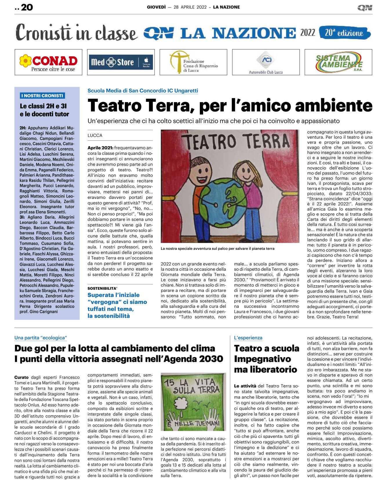 Le cose iniziavano a farsi più chiare. Non si trattava solo di imparare a recitare, ma di portare in scena un copione scritto da noi, dedicato alla sostenibilità, alla salvaguardia e alla cura del nostro pianeta. Molti di noi pensarono: “Tutto sommato, non male… a scuola parliamo spesso di rispetto della Terra, di cambiamenti climatici, di Agenda 2030.” “Proviamoci! È arrivato il momento di metterci in gioco e di impegnarci per salvaguardare il nostro pianeta che è sempre più in pericolo”. La settimana successiva incontrammo Laura e Francesco, i due giovani professionisti che ci hanno ac-compagnato in questa lunga avventura. Per loro il teatro è una vera e propria passione, uno svago oltre che un lavoro. Ci hanno insegnato a non arrenderci e a seguire le nostre inclinazioni. E così, tra alti e bassi, il canovaccio dell’esibizione L’uomo del passato, l’uomo del futuro ha preso forma: un giorno Ivan, il protagonista, scava per terra e trova un foglio tutto stropicciato, datato 22/04/3033: “Strana coincidenza” dice “oggi è il 22 aprile 2022!”. Assieme all’amica Gaia lo esamina meglio e scopre che si tratta della Carta dei diritti degli elementi della natura. È tutto così surreale… ma è anche è una scoperta sensazionale! È la natura che sta lanciando il suo grido di allarme: tutto il pianeta è in pericolo, uomo compreso. I due ragazzi capiscono che non c’è tempo da perdere. Iniziano allora a “correre” per invertire la rotta degli eventi, alzeranno la loro voce al cielo e si faranno carico di una missione speciale: sensibilizzare l’umanità verso la salvaguardia della Terra. Ivan e Gaia potremmo essere tutti noi, testimoni di un presente che, con gli adeguati accorgimenti, ci porterà a non sprofondare nelle tenebre. Grazie, Teatro Terra!