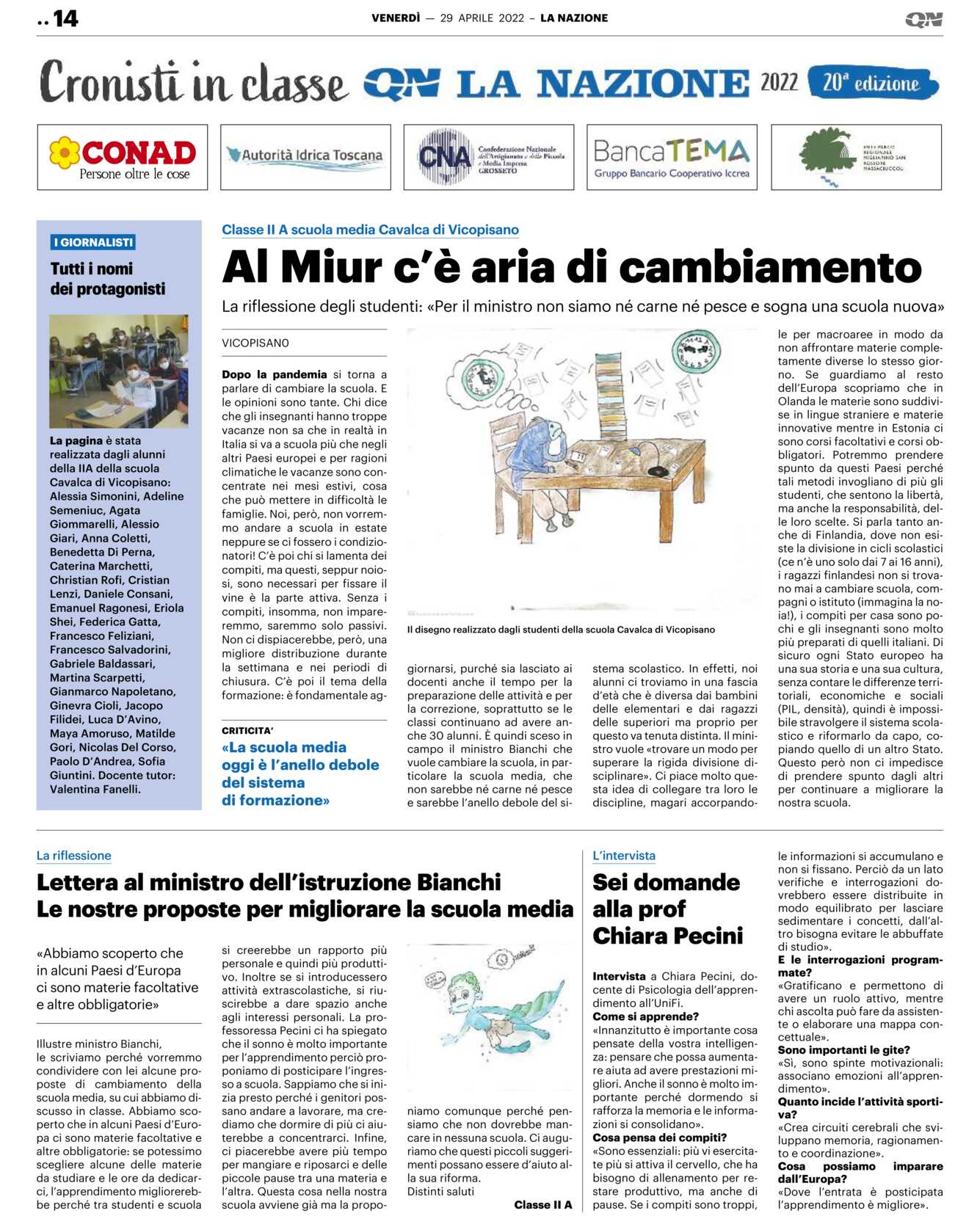VICOPISANO Dopo la pandemia si torna a parlare di cambiare la scuola. E le opinioni sono tante. Chi dice che gli insegnanti hanno troppe vacanze non sa che in realtà in Italia si va a scuola più che negli altri Paesi europei e per ragioni climatiche le vacanze sono concentrate nei mesi estivi, cosa che può mettere in difficoltà le famiglie. Noi, però, non vorremmo andare a scuola in estate neppure se ci fossero i condizionatori! C’è poi chi si lamenta dei compiti, ma questi, seppur noiosi, sono necessari per fissare il vine è la parte attiva. Senza i compiti, insomma, non impareremmo, saremmo solo passivi.