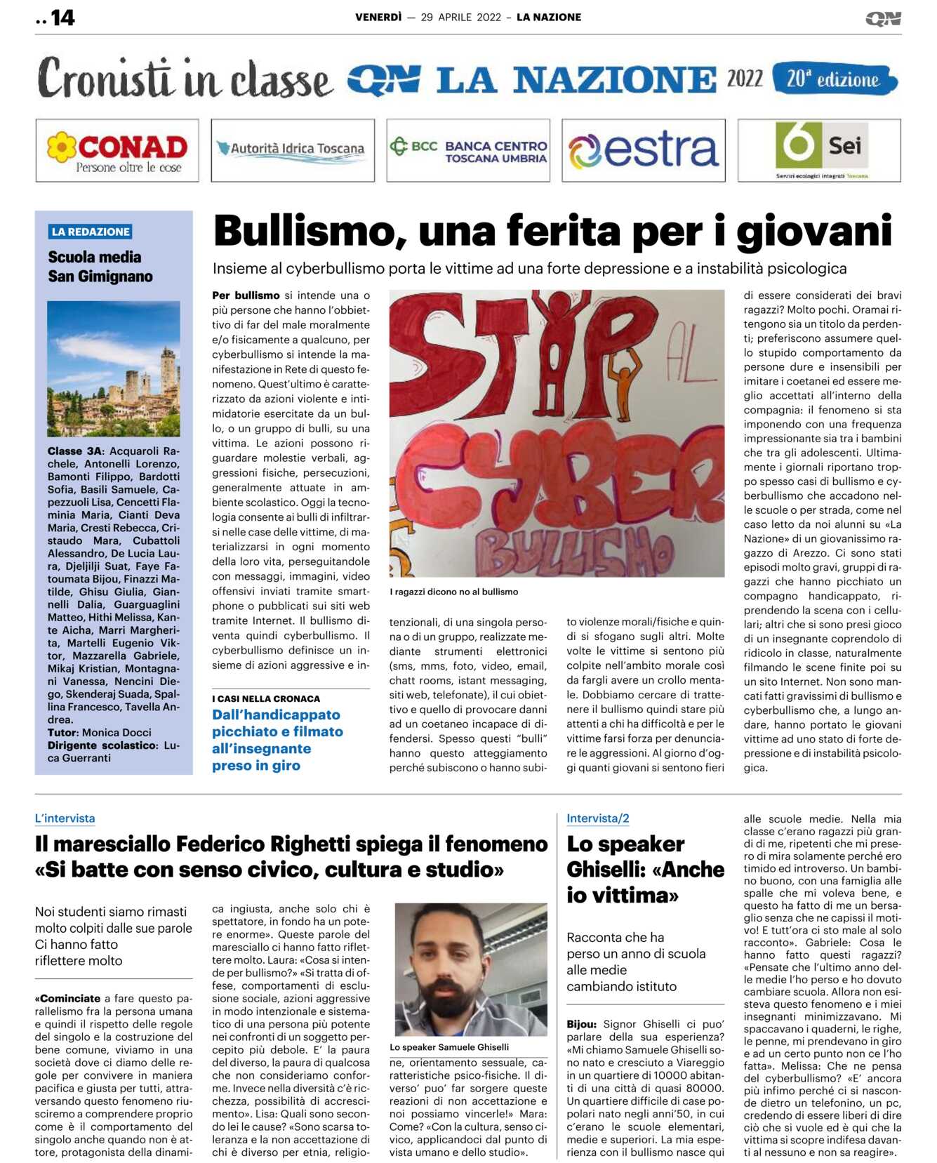 Per bullismo si intende una o più persone che hanno l’obbiettivo di far del male moralmente e/o fisicamente a qualcuno, per cyberbullismo si intende la manifestazione in Rete di questo fenomeno. Quest’ultimo è caratterizzato da azioni violente e intimidatorie esercitate da un bullo, o un gruppo di bulli, su una vittima. Le azioni possono riguardare molestie verbali, aggressioni fisiche, persecuzioni, generalmente attuate in ambiente scolastico. Oggi la tecnologia consente ai bulli di infiltrarsi nelle case delle vittime, di materializzarsi in ogni momento della loro vita, perseguitandole con messaggi, immagini, video offensivi inviati tramite smartphone o pubblicati sui siti web tramite Internet. Il bullismo diventa quindi cyberbullismo. Il cyberbullismo definisce un insieme di azioni aggressive e intenzionali, di una singola persona o di un gruppo, realizzate mediante strumenti elettronici (sms, mms, foto, video, email, chat rooms, instant messaging, siti web, telefonate), il cui obiettivo e quello di provocare danni ad un coetaneo incapace di difendersi. Spesso questi “bulli” hanno questo atteggiamento perché subiscono o hanno subito violenze morali/fisiche e quindi si sfogano sugli altri. Molte volte le vittime si sentono più colpite nell’ambito morale così da fargli avere un crollo mentale. Dobbiamo cercare di trattenere il bullismo quindi stare più attenti a chi ha difficoltà e per le vittime farsi forza per denunciare le aggressioni. Al giorno d’oggi quanti giovani si sentono fieri di essere considerati dei bravi ragazzi? Molto pochi. Oramai ritengono sia un titolo da perdenti; preferiscono assumere quello stupido comportamento da persone dure e insensibili per imitare i coetanei ed essere meglio accettati all’interno della compagnia: il fenomeno si sta imponendo con una frequenza impressionante sia tra i bambini che tra gli adolescenti. Ultimamente i giornali riportano troppo spesso casi di bullismo e cyberbullismo che accadono nelle scuole o per strada, come nel caso letto da noi alunni su «La Nazione» di un giovanissimo ragazzo di Arezzo. Ci sono stati episodi molto gravi, gruppi di ragazzi che hanno picchiato un compagno handicappato, riprendendo la scena con i cellulari; altri che si sono presi gioco di un insegnante coprendolo di ridicolo in classe, naturalmente filmando le scene finite poi su un sito Internet. Non sono mancati fatti gravissimi di bullismo e cyberbullismo che, a lungo andare, hanno portato le giovani vittime ad uno stato di forte depressione e di instabilità psicologica.