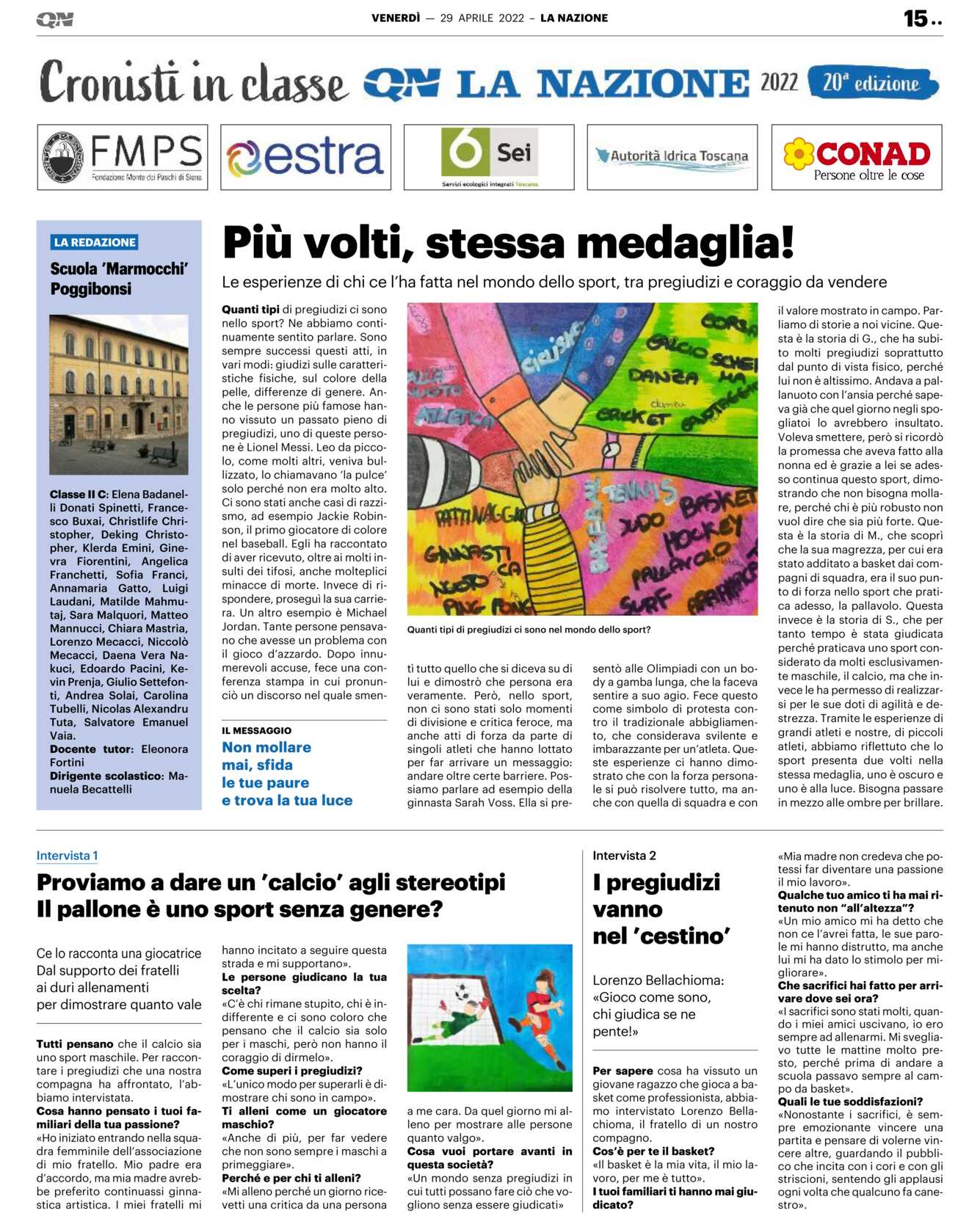 Ci sono stati anche casi di razzismo, ad esempio Jackie Robinson, il primo giocatore di colore nel baseball. Egli ha raccontato di aver ricevuto, oltre ai molti insulti dei tifosi, anche molteplici minacce di morte. Invece di rispondere, proseguì la sua carriera. Un altro esempio è Michael Jordan. Tante persone pensavano che avesse un problema con il gioco d’azzardo. Dopo innumerevoli accuse, fece una conferenza stampa in cui pronunciò un discorso nel quale smentì tutto quello che si diceva su di lui e dimostrò che persona era veramente. Però, nello sport, non ci sono stati solo momenti di divisione e critica feroce, ma anche atti di forza da parte di singoli atleti che hanno lottato per far arrivare un messaggio: andare oltre certe barriere. Possiamo parlare ad esempio della ginnasta Sarah Voss. Ella si presentò alle Olimpiadi con un body a gamba lunga, che la faceva sentire a suo agio. Fece questo come simbolo di protesta contro il tradizionale abbigliamento, che considerava svilente e imbarazzante per un’atleta. Queste esperienze ci hanno dimostrato che con la forza personale si può risolvere tutto, ma anche con quella di squadra e con il valore mostrato in campo. Parliamo di storie a noi vicine. Questa è la storia di G., che ha subito molti pregiudizi soprattutto dal punto di vista fisico, perché lui non è altissimo. Andava a pallanuoto con l’ansia perché sapeva già che quel giorno negli spogliatoi lo avrebbero insultato.