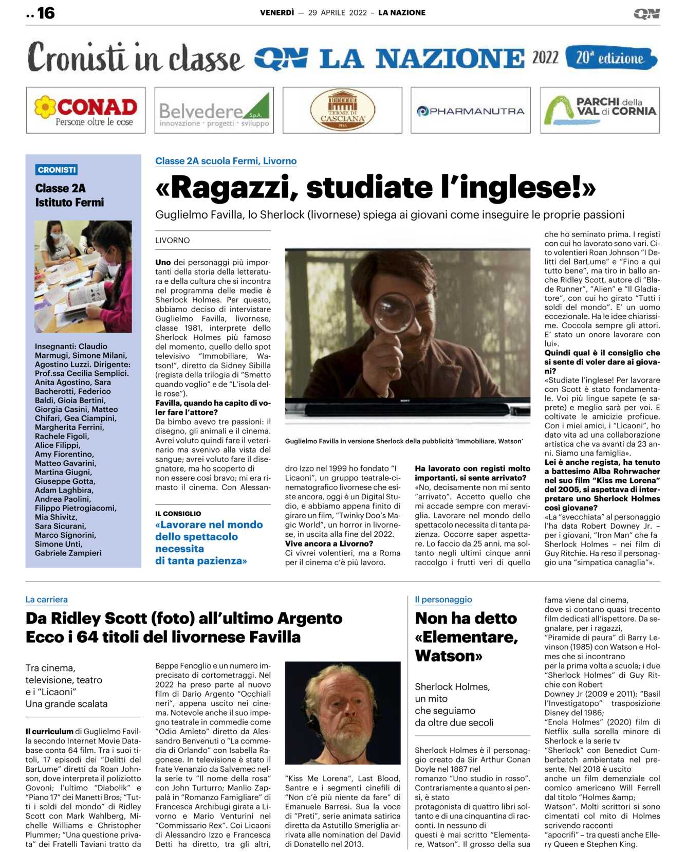 LIVORNO Uno dei personaggi più importanti della storia della letteratura e della cultura che si incontra nel programma delle medie è Sherlock Holmes. Per questo, abbiamo deciso di intervistare Guglielmo Favilla, livornese, classe 1981, interprete dello Sherlock Holmes più famoso del momento, quello dello spot televisivo “Immobiliare, Watson!”, diretto da Sidney Sibilla (regista della trilogia di “Smetto quando voglio” e de “L’isola delle rose”).