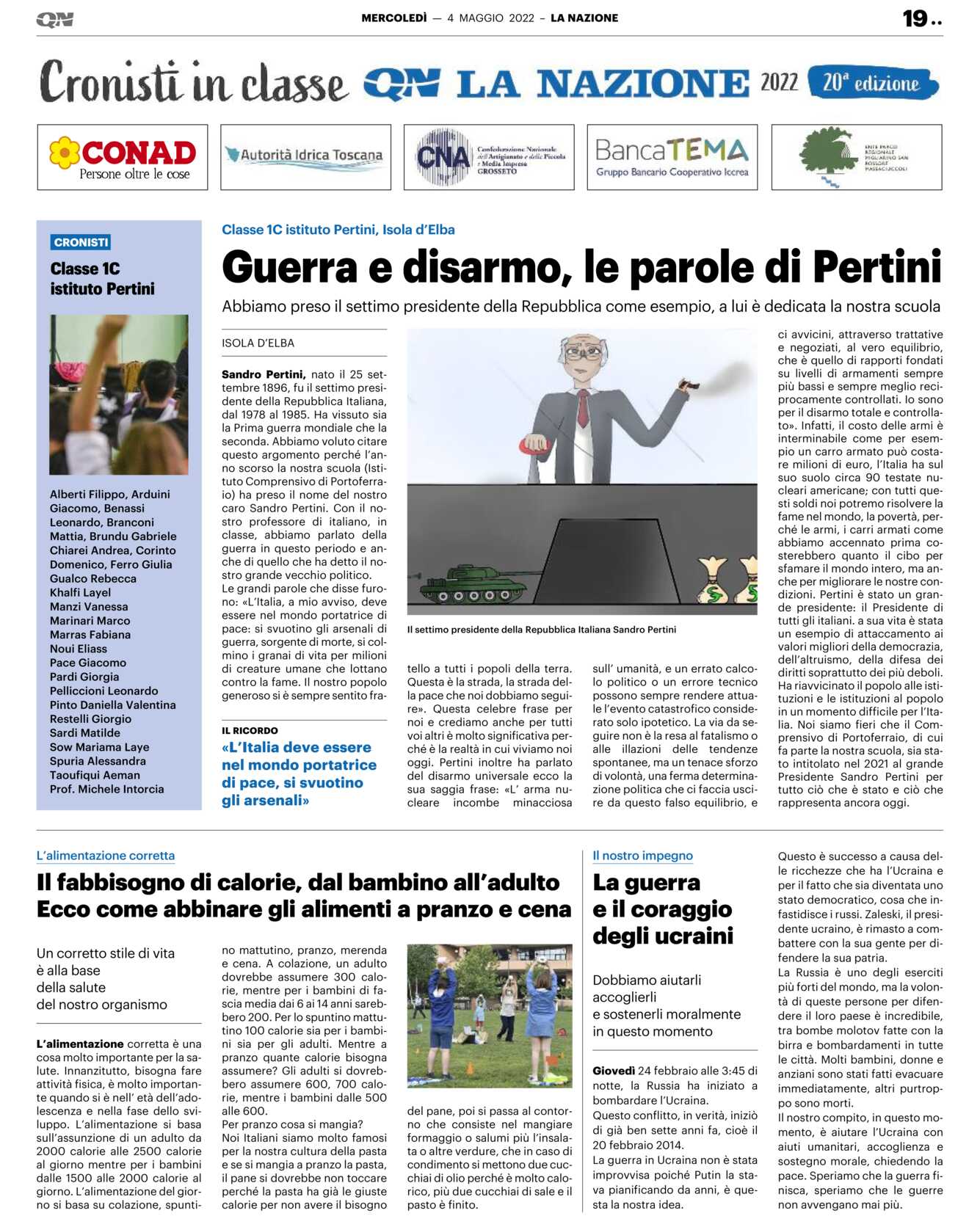 ISOLA D’ELBA Sandro Pertini, nato il 25 settembre 1896, fu il settimo presidente della Repubblica Italiana, dal 1978 al 1985. Ha vissuto sia la Prima guerra mondiale che la seconda. Abbiamo voluto citare questo argomento perché l’anno scorso la nostra scuola (Istituto Comprensivo di Portoferraio) ha preso il nome del nostro caro Sandro Pertini. Con il nostro professore di italiano, in classe, abbiamo parlato della guerra in questo periodo e anche di quello che ha detto il nostro grande vecchio politico.