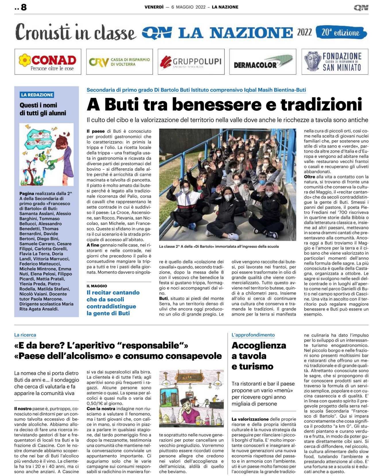 Oltre alla vita a contatto con la natura, si trovano di fronte una comunità che conserva la cultura del Maggio, il «recitar cantando» che da secoli contraddistingue la gente di Buti. Smessi i panni del pastore, il poeta Pietro Frediani nel ‘700 riscriveva in quartine storie dalla Bibbia o dalla letteratura classica e, insieme ad altri paesani, mettevano in scena drammi cantati che presentavano alla comunità. Ancora oggi a Buti troviamo il Maggio e l’amore per la terra e il cibo sano che viene valorizzato in particolari momenti dell’anno nella formula delle sagre. La più conosciuta è quella della Castagna, organizzata a ottobre. Le sagre si svolgono nelle sedi delle contrade o in luoghi all’aperto come nel parco Danielli di Buti o nel campo sportivo di Cascine. Una vita in ascolto con il territorio può regalare maggiore benessere e Buti può essere un esempio.
