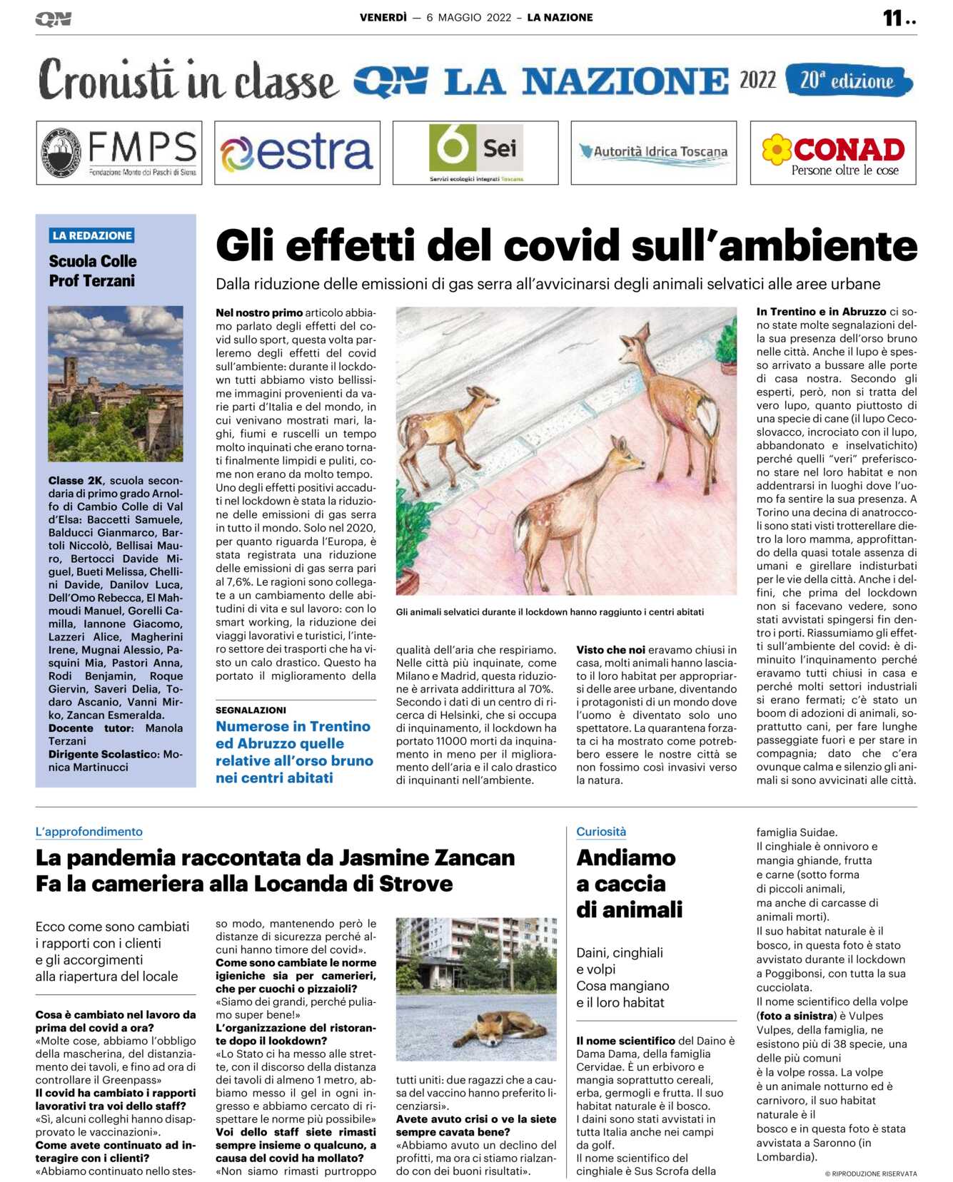 Secondo i dati di un centro di ricerca di Helsinki, che si occupa di inquinamento, il lockdown ha portato 11000 morti da inquinamento in meno per il miglioramento dell’aria e il calo drastico di inquinanti nell’ambiente. Visto che noi eravamo chiusi in casa, molti animali hanno lasciato il loro habitat per appropriarsi delle aree urbane, diventando i protagonisti di un mondo dove l’uomo è diventato solo uno spettatore. La quarantena forzata ci ha mostrato come potrebbero essere le nostre città se non fossimo così invasivi verso la natura. In Trentino e in Abruzzo ci sono state molte segnalazioni della sua presenza dell’orso bruno nelle città. Anche il lupo è spesso arrivato a bussare alle porte di casa nostra. Secondo gli esperti, però, non si tratta del vero lupo, quanto piuttosto di una specie di cane (il lupo Cecoslovacco, incrociato con il lupo, abbandonato e inselvatichito) perché quelli “veri” preferiscono stare nel loro habitat e non addentrarsi in luoghi dove l’uomo fa sentire la sua presenza. A Torino una decina di anatroccoli sono stati visti trotterellare dietro la loro mamma, approfittando della quasi totale assenza di umani e girellare indisturbati per le vie della città. Anche i delfini, che prima del lockdown non si facevano vedere, sono stati avvistati spingersi fin dentro i porti. Riassumiamo gli effetti sull’ambiente del covid: è diminuito l’inquinamento perché eravamo tutti chiusi in casa e perché molti settori industriali si erano fermati; c’è stato un boom di adozioni di animali, soprattutto cani, per fare lunghe passeggiate fuori e per stare in compagnia; dato che c’era ovunque calma e silenzio gli animali si sono avvicinati alle città.
