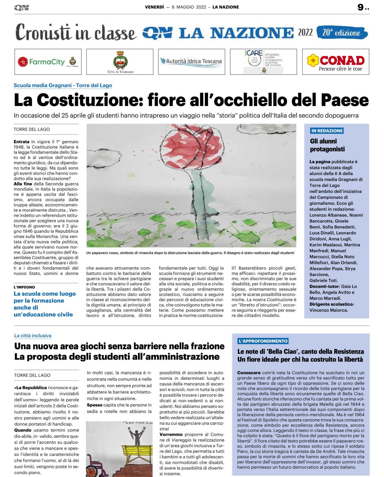 Alla fine della Seconda guerra mondiale, in Italia la popolazione è appena uscita dal fascismo, ancora occupata dalle truppe alleate, economicamente e moralmente distrutta.. Venne indetto un referendum istituzionale per scegliere una nuova forma di governo: era il 2 giugno 1946 quando la Repubblica vinse sulla Monarchia. Una ventata d’aria nuova nella politica, alla quale servivano nuove norme. Questo fu il compito dell’Assemblea Costituente, gruppo di deputati chiamati a fissare i diritti e i doveri fondamentali del nuovo Stato, uomini e donne che avevano attivamente combattuto contro le barbarie della guerra tra le schiere partigiane e che conoscevano il valore della libertà. Tra i pilastri della Costituzione abbiamo dato valore in classe al riconoscimento della dignità umana, al principio di uguaglianza, alla centralità del lavoro e all’istruzione, diritto fondamentale per tutti. Oggi la scuola fornisce gli strumenti necessari e prepara i suoi studenti alla vita sociale, politica e civile: grazie al nuovo ordinamento scolastico, riusciamo a seguire dei percorsi di educazione civica, che coinvolgono tutte le materie. Come possiamo mettere in pratica le norme costituzionali? Basterebbero piccoli gesti, ma efficaci: rispettare il prossimo, non discriminalo per le sue disabilità, per il diverso credo religioso, orientamento sessuale o per le scarse possibilità economiche. La nostra Costituzione è un “libretto d’istruzioni”: occorre seguirla e rileggerla per essere dei cittadini modello.