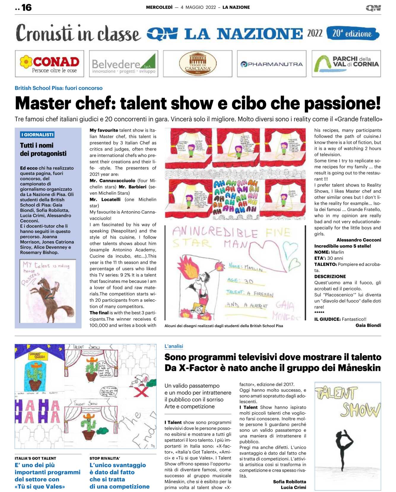 My favourite talent show is Italian Master chef, this talent is presented by 3 Italian Chef as critics and judges, often there are international chefs who present their creations and their life-style. The presenters of 2021 year are: Mr. Cannavacciuolo (four Michelin stars) Mr. Barbieri (seven Michelin Stars) Mr. Locatelli (one Michelin star) My favourite is Antonino Cannavacciuolo! I am fascinated by his way of speaking (Neapolitan) and the style of his cuisine, I follow other talents shows about him (example Antonino Academy, Cucine da incubo, etc…).This year is the 11 th season and the percentage of users who liked this TV series: 9 2% It is a talent that fascinates me because I am a lover of food and raw materials.The competition starts with 20 participants from a selection of many competitors.