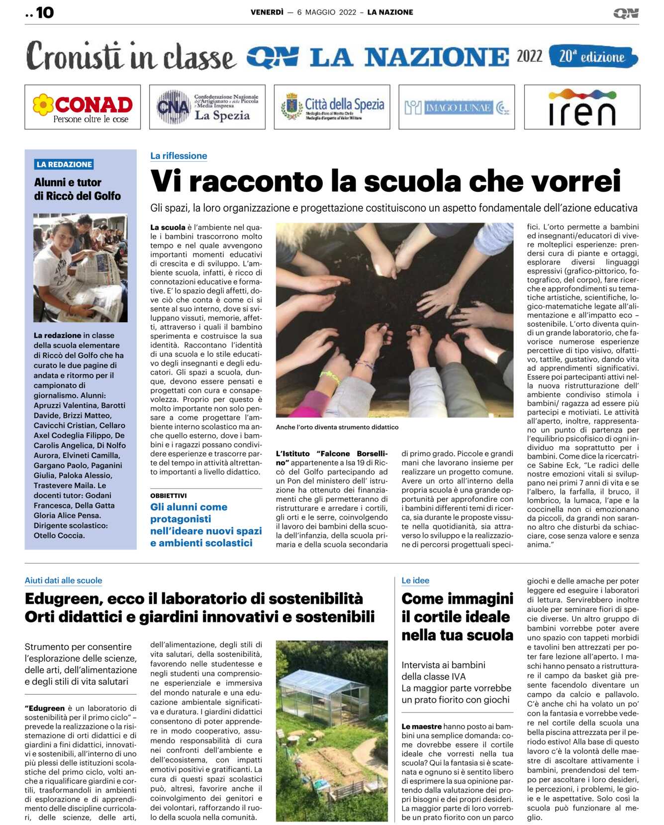 La scuola è l’ambiente nel quale i bambini trascorrono molto tempo e nel quale avvengono importanti momenti educativi di crescita e di sviluppo. L’ambiente scuola, infatti, è ricco di connotazioni educative e formative. E’ lo spazio degli affetti, dove ciò che conta è come ci si sente al suo interno, dove si sviluppano vissuti, memorie, affetti, attraverso i quali il bambino sperimenta e costruisce la sua identità. Raccontano l’identità di una scuola e lo stile educativo degli insegnanti e degli educatori. Gli spazi a scuola, dunque, devono essere pensati e progettati con cura e consapevolezza. Proprio per questo è molto importante non solo pensare a come progettare l’ambiente interno scolastico ma anche quello esterno, dove i bambini e i ragazzi possano condividere esperienze e trascorre parte del tempo in attività altrettanto importanti a livello didattico. L’Istituto “Falcone Borsellino” appartenente a Isa 19 di Riccò del Golfo partecipando ad un Pon del ministero dell’ istruzione ha ottenuto dei finanziamenti che gli permetteranno di ristrutturare e arredare i cortili, gli orti e le serre, coinvolgendo il lavoro dei bambini della scuola dell’infanzia, della scuola primaria e della scuola secondaria di primo grado. Piccole e grandi mani che lavorano insieme per realizzare un progetto comune.
