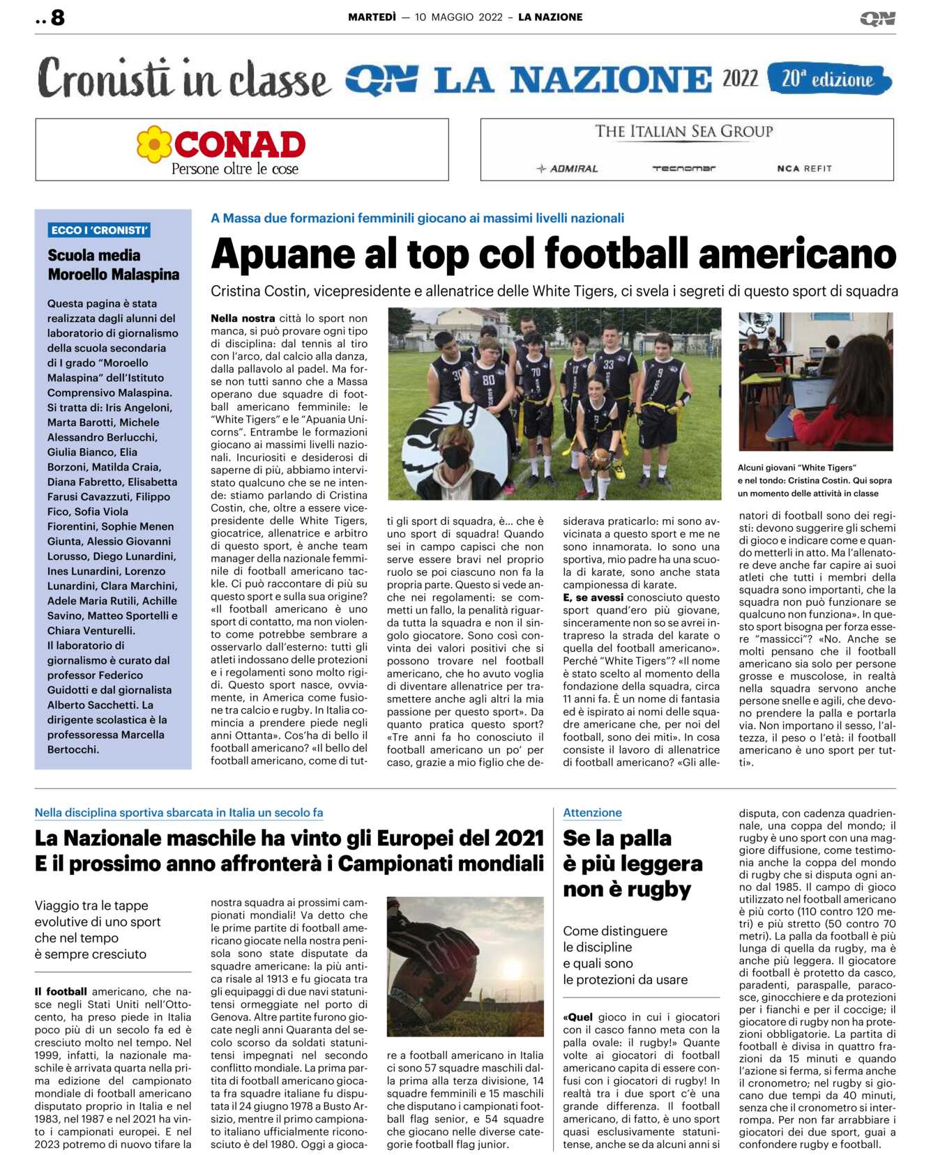 Nella nostra città lo sport non manca, si può provare ogni tipo di disciplina: dal tennis al tiro con l’arco, dal calcio alla danza, dalla pallavolo al padel. Ma forse non tutti sanno che a Massa operano due squadre di football americano femminile: le “White Tigers” e le “Apuania Unicorns”. Entrambe le formazioni giocano ai massimi livelli nazionali. Incuriositi e desiderosi di saperne di più, abbiamo intervistato qualcuno che se ne intende: stiamo parlando di Cristina Costin, che, oltre a essere vicepresidente delle White Tigers, giocatrice, allenatrice e arbitro di questo sport, è anche team manager della nazionale femminile di football americano tackle. Ci può raccontare di più su questo sport e sulla sua origine? «Il football americano è uno sport di contatto, ma non violento come potrebbe sembrare a osservarlo dall’esterno: tutti gli atleti indossano delle protezioni e i regolamenti sono molto rigidi. Questo sport nasce, ovviamente, in America come fusione tra calcio e rugby. In Italia comincia a prendere piede negli anni Ottanta». Cos’ha di bello il football americano? «Il bello del football americano, come di tutti gli sport di squadra, è… che è uno sport di squadra! Quando sei in campo capisci che non serve essere bravi nel proprio ruolo se poi ciascuno non fa la propria parte. Questo si vede anche nei regolamenti: se commetti un fallo, la penalità riguarda tutta la squadra e non il singolo giocatore. Sono così convinta dei valori positivi che si possono trovare nel football americano, che ho avuto voglia di diventare allenatrice per trasmettere anche agli altri la mia passione per questo sport». Da quanto pratica questo sport? «Tre anni fa ho conosciuto il football americano un po’ per caso, grazie a mio figlio che desiderava praticarlo: mi sono avvicinata a questo sport e me ne sono innamorata. Io sono una sportiva, mio padre ha una scuola di karate, sono anche stata campionessa di karate.