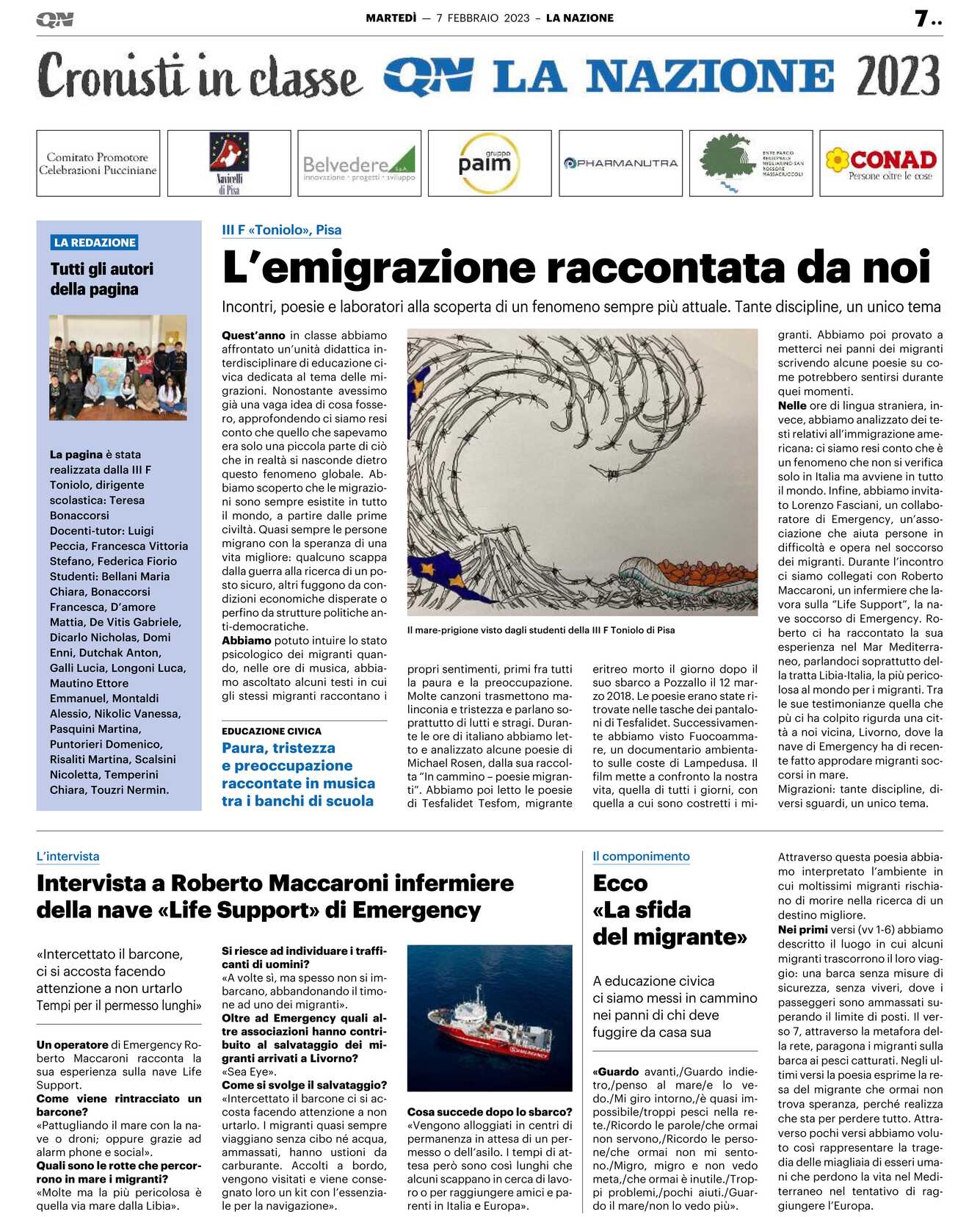 Nelle ore di lingua straniera, invece, abbiamo analizzato dei testi relativi all’immigrazione americana: ci siamo resi conto che è un fenomeno che non si verifica solo in Italia ma avviene in tutto il mondo. Infine, abbiamo invitato Lorenzo Fasciani, un collaboratore di Emergency, un’associazione che aiuta persone in difficoltà e opera nel soccorso dei migranti. Durante l’incontro ci siamo collegati con Roberto Maccaroni, un infermiere che lavora sulla “Life Support”, la nave soccorso di Emergency. Roberto ci ha raccontato la sua esperienza nel Mar Mediterraneo, parlandoci soprattutto della tratta Libia-Italia, la più pericolosa al mondo per i migranti. Tra le sue testimonianze quella che pù ci ha colpito rigurda una città a noi vicina, Livorno, dove la nave di Emergency ha di recente fatto approdare migranti soccorsi in mare.