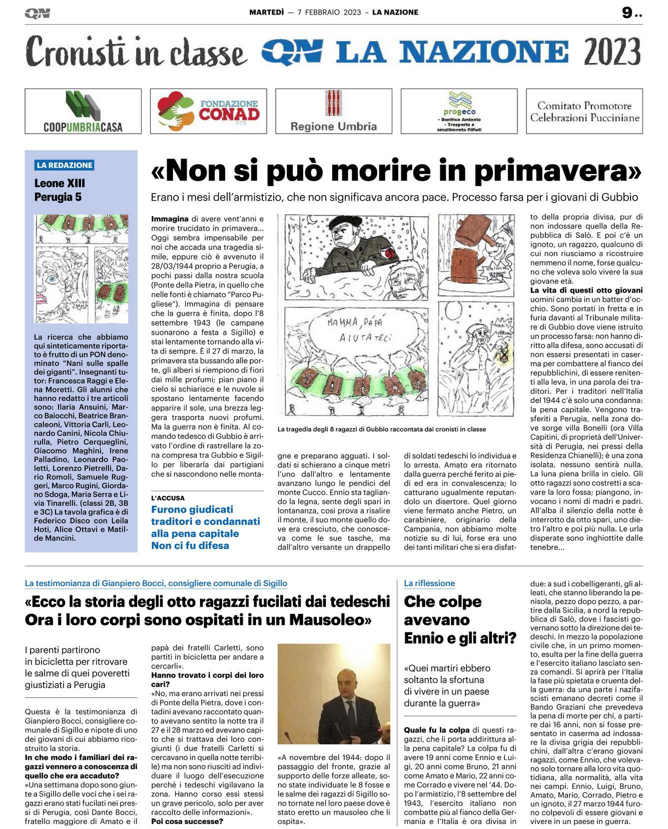 Immagina di avere vent’anni e morire trucidato in primavera… Oggi sembra impensabile per noi che accada una tragedia simile, eppure ciò è avvenuto il 28/03/1944 proprio a Perugia, a pochi passi dalla nostra scuola (Ponte della Pietra, in quello che nelle fonti è chiamato “Parco Pugliese”). Immagina di pensare che la guerra è finita, dopo l’8 settembre 1943 (le campane suonarono a festa a Sigillo) e stai lentamente tornando alla vita di sempre. È il 27 di marzo, la primavera sta bussando alle porte, gli alberi si riempiono di fiori dai mille profumi; pian piano il cielo si schiarisce e le nuvole si spostano lentamente facendo apparire il sole, una brezza leggera trasporta nuovi profumi.