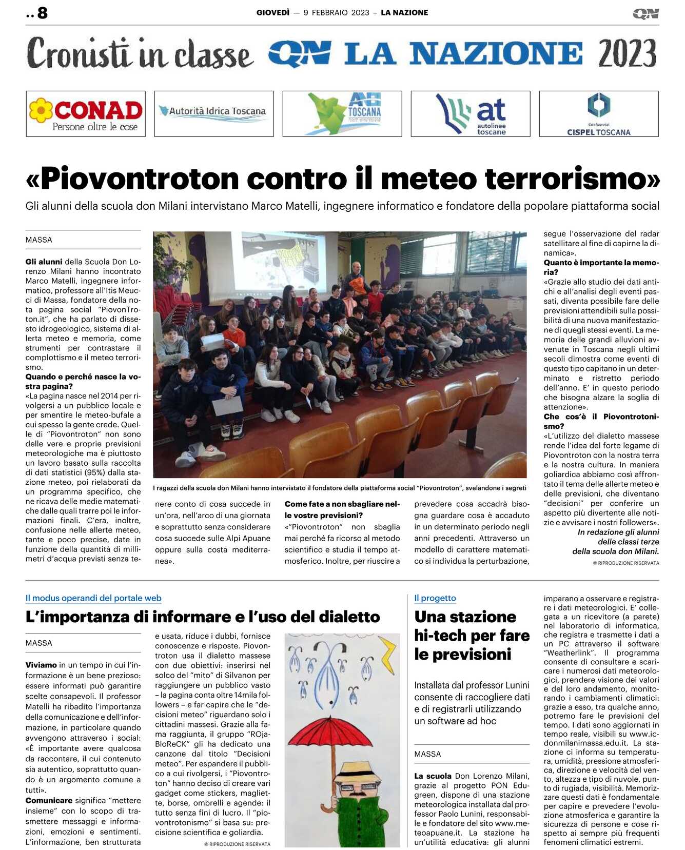 Che cos’è il Piovontrotonismo? «L’utilizzo del dialetto massese rende l’idea del forte legame di Piovontroton con la nostra terra e la nostra cultura. In maniera goliardica abbiamo così affrontato il tema delle allerte meteo e delle previsioni, che diventano “decisioni” per conferire un aspetto più divertente alle notizie e avvisare i nostri followers».In redazione gli alunnidelle classi terzedella scuola don Milani.