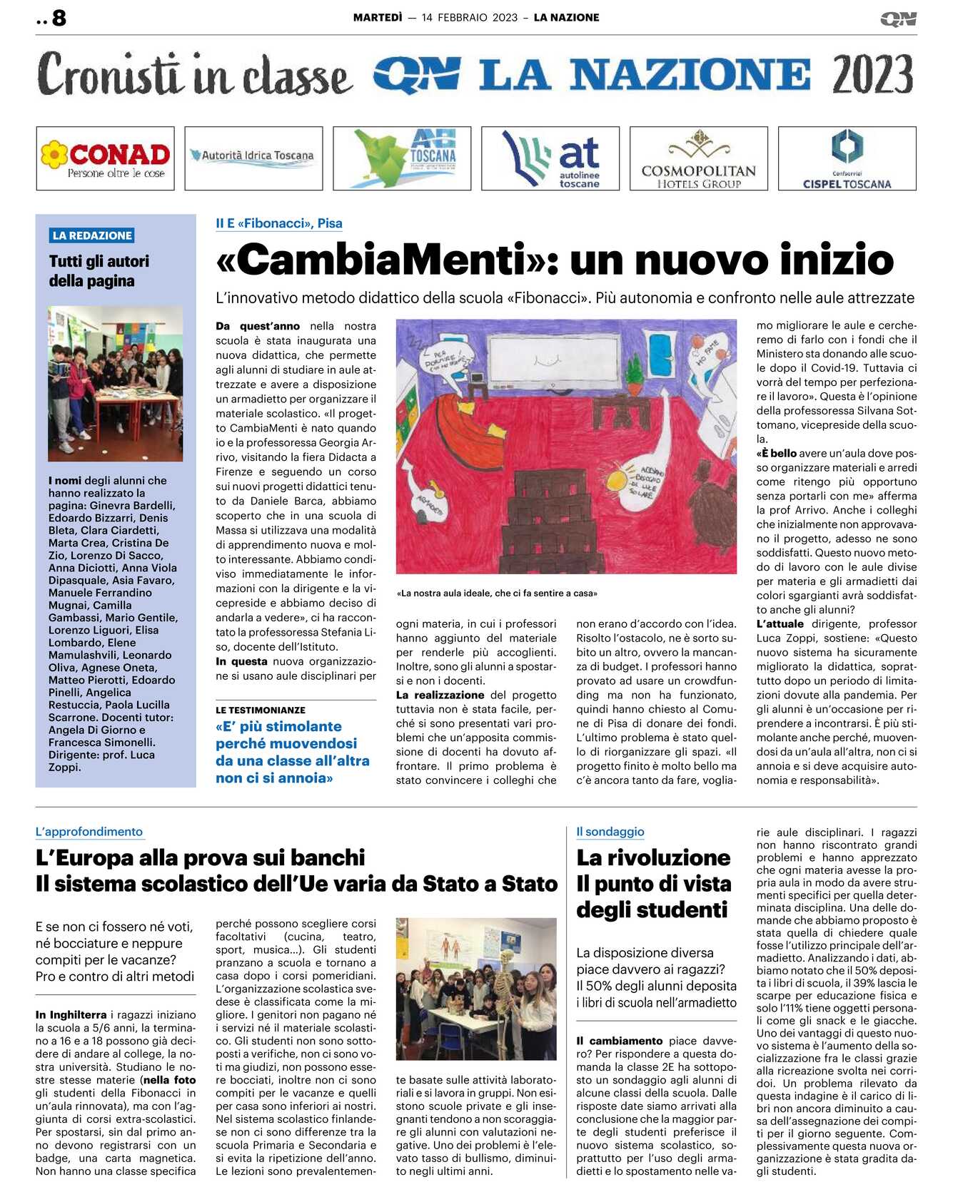 «È bello avere un’aula dove posso organizzare materiali e arredi come ritengo più opportuno senza portarli con me» afferma la prof Arrivo. Anche i colleghi che inizialmente non approvavano il progetto, adesso ne sono soddisfatti. Questo nuovo metodo di lavoro con le aule divise per materia e gli armadietti dai colori sgargianti avrà soddisfatto anche gli alunni? L’attuale dirigente, professor Luca Zoppi, sostiene: «Questo nuovo sistema ha sicuramente migliorato la didattica, soprattutto dopo un periodo di limitazioni dovute alla pandemia. Per gli alunni è un’occasione per riprendere a incontrarsi. È più stimolante anche perché, muovendosi da un’aula all’altra, non ci si annoia e si deve acquisire autonomia e responsabilità».