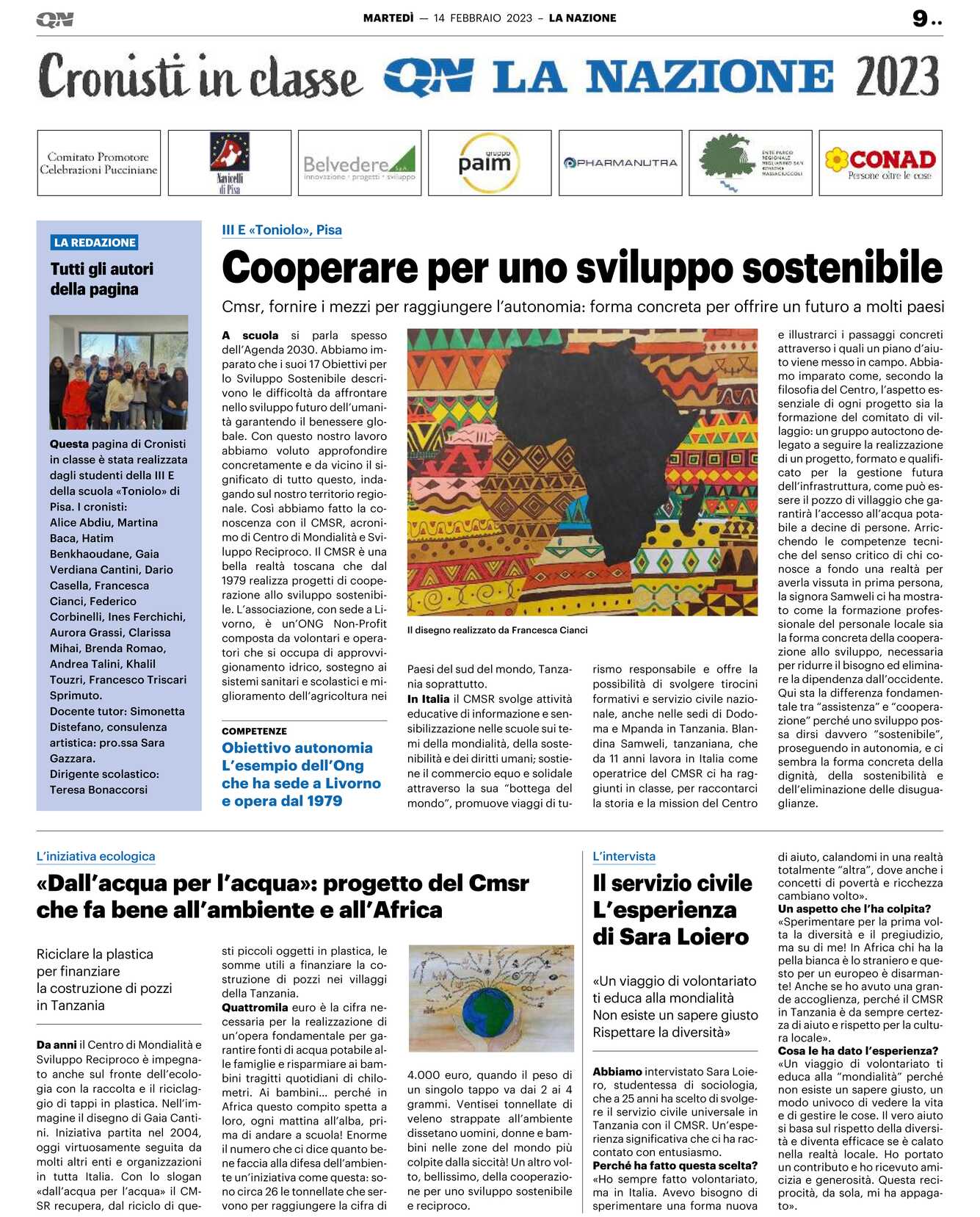 A scuola si parla spesso dell’Agenda 2030. Abbiamo imparato che i suoi 17 Obiettivi per lo Sviluppo Sostenibile descrivono le difficoltà da affrontare nello sviluppo futuro dell’umanità garantendo il benessere globale. Con questo nostro lavoro abbiamo voluto approfondire concretamente e da vicino il significato di tutto questo, indagando sul nostro territorio regionale. Così abbiamo fatto la conoscenza con il CMSR, acronimo di Centro di Mondialità e Sviluppo Reciproco. Il CMSR è una bella realtà toscana che dal 1979 realizza progetti di cooperazione allo sviluppo sostenibile. L’associazione, con sede a Livorno, è un’ONG Non-Profit composta da volontari e operatori che si occupa di approvvigionamento idrico, sostegno ai sistemi sanitari e scolastici e miglioramento dell’agricoltura nei Paesi del sud del mondo, Tanzania soprattutto.