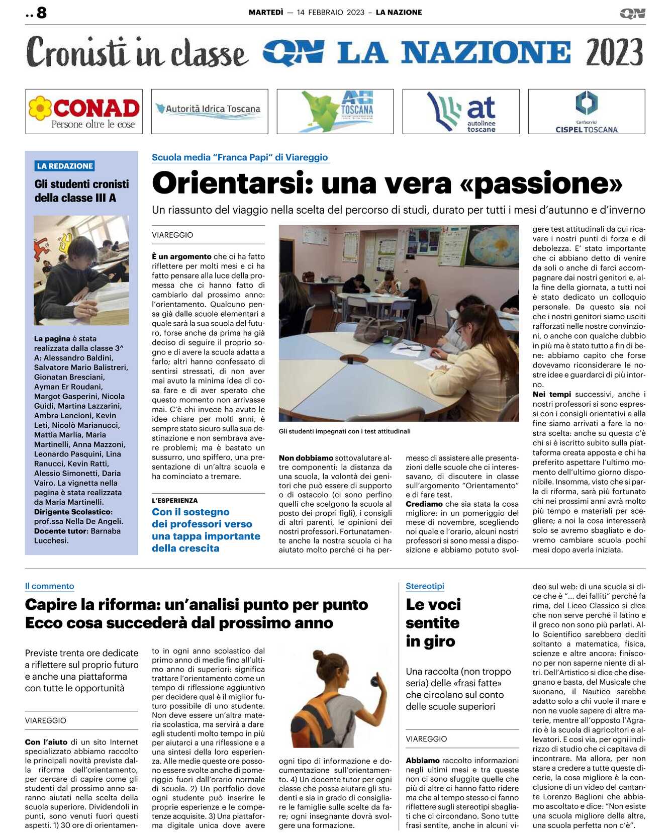 VIAREGGIO È un argomento che ci ha fatto riflettere per molti mesi e ci ha fatto pensare alla luce della promessa che ci hanno fatto di cambiarlo dal prossimo anno: l’orientamento. Qualcuno pensa già dalle scuole elementari a quale sarà la sua scuola del futuro, forse anche da prima ha già deciso di seguire il proprio sogno e di avere la scuola adatta a farlo; altri hanno confessato di sentirsi stressati, di non aver mai avuto la minima idea di cosa fare e di aver sperato che questo momento non arrivasse mai. C’è chi invece ha avuto le idee chiare per molti anni, è sempre stato sicuro sulla sua destinazione e non sembrava avere problemi; ma è bastato un sussurro, uno spiffero, una presentazione di un’altra scuola e ha cominciato a tremare. Non dobbiamo sottovalutare altre componenti: la distanza da una scuola, la volontà dei genitori che può essere di supporto o di ostacolo (ci sono perfino quelli che scelgono la scuola al posto dei propri figli), i consigli di altri parenti, le opinioni dei nostri professori. Fortunatamente anche la nostra scuola ci ha aiutato molto perché ci ha per-messo di assistere alle presentazioni delle scuole che ci interessavano, di discutere in classe sull’argomento “Orientamento” e di fare test.