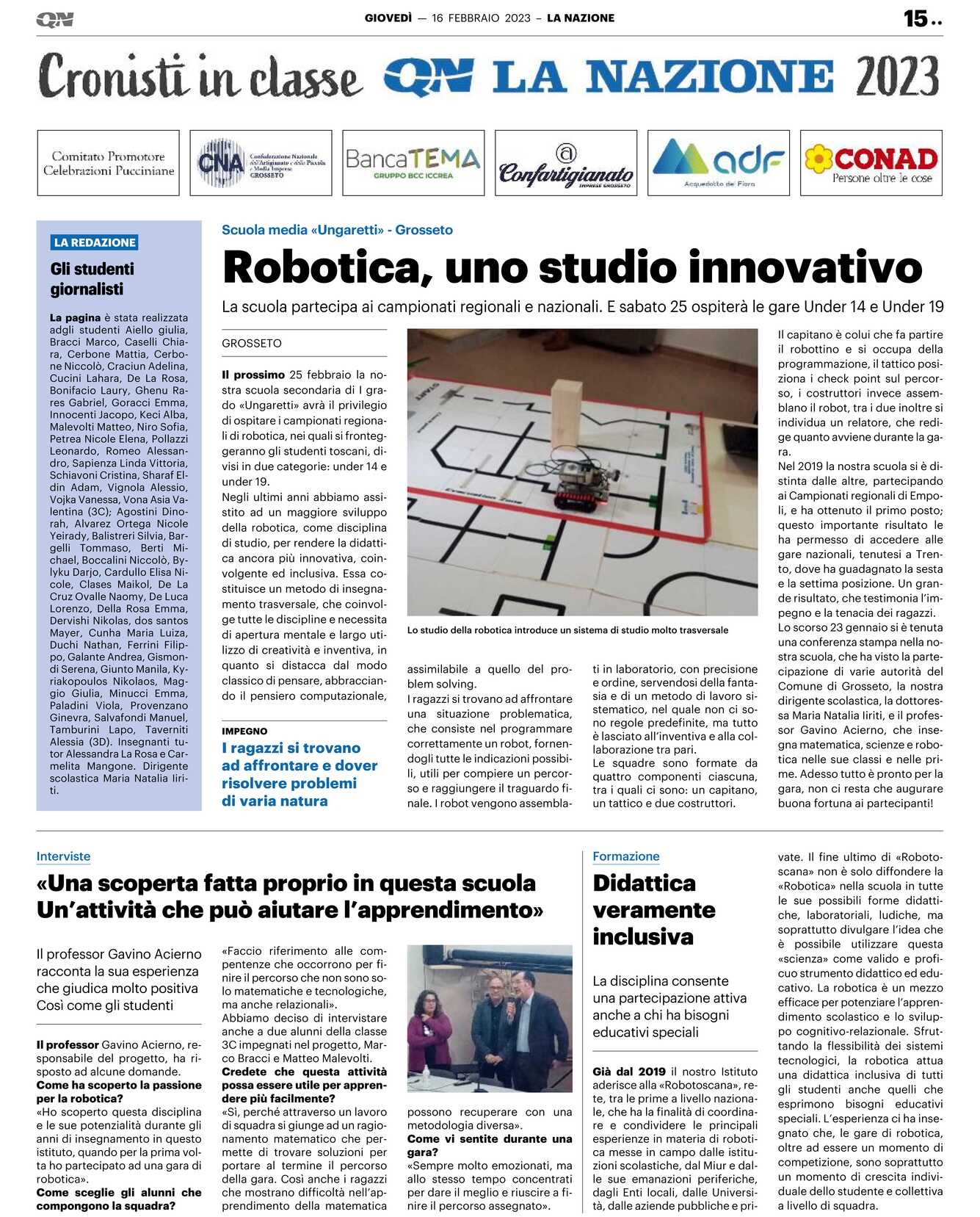 Lo scorso 23 gennaio si è tenuta una conferenza stampa nella nostra scuola, che ha visto la partecipazione di varie autorità del Comune di Grosseto, la nostra dirigente scolastica, la dottoressa Maria Natalia Iiriti, e il professor Gavino Acierno, che insegna matematica, scienze e robotica nelle sue classi e nelle prime. Adesso tutto è pronto per la gara, non ci resta che augurare buona fortuna ai partecipanti!