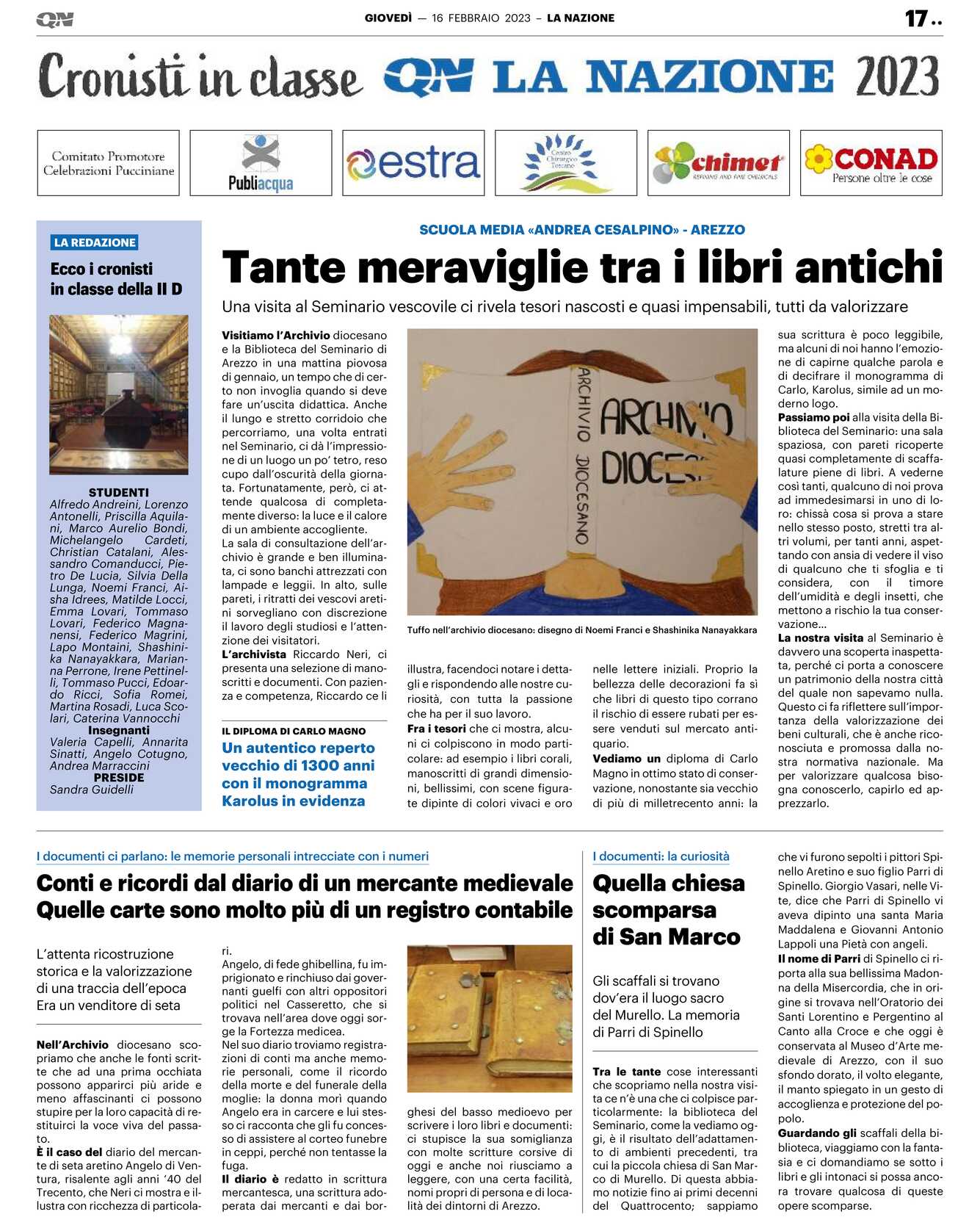 Visitiamo l’Archivio diocesano e la Biblioteca del Seminario di Arezzo in una mattina piovosa di gennaio, un tempo che di certo non invoglia quando si deve fare un’uscita didattica. Anche il lungo e stretto corridoio che percorriamo, una volta entrati nel Seminario, ci dà l’impressione di un luogo un po’ tetro, reso cupo dall’oscurità della giornata. Fortunatamente, però, ci attende qualcosa di completamente diverso: la luce e il calore di un ambiente accogliente.