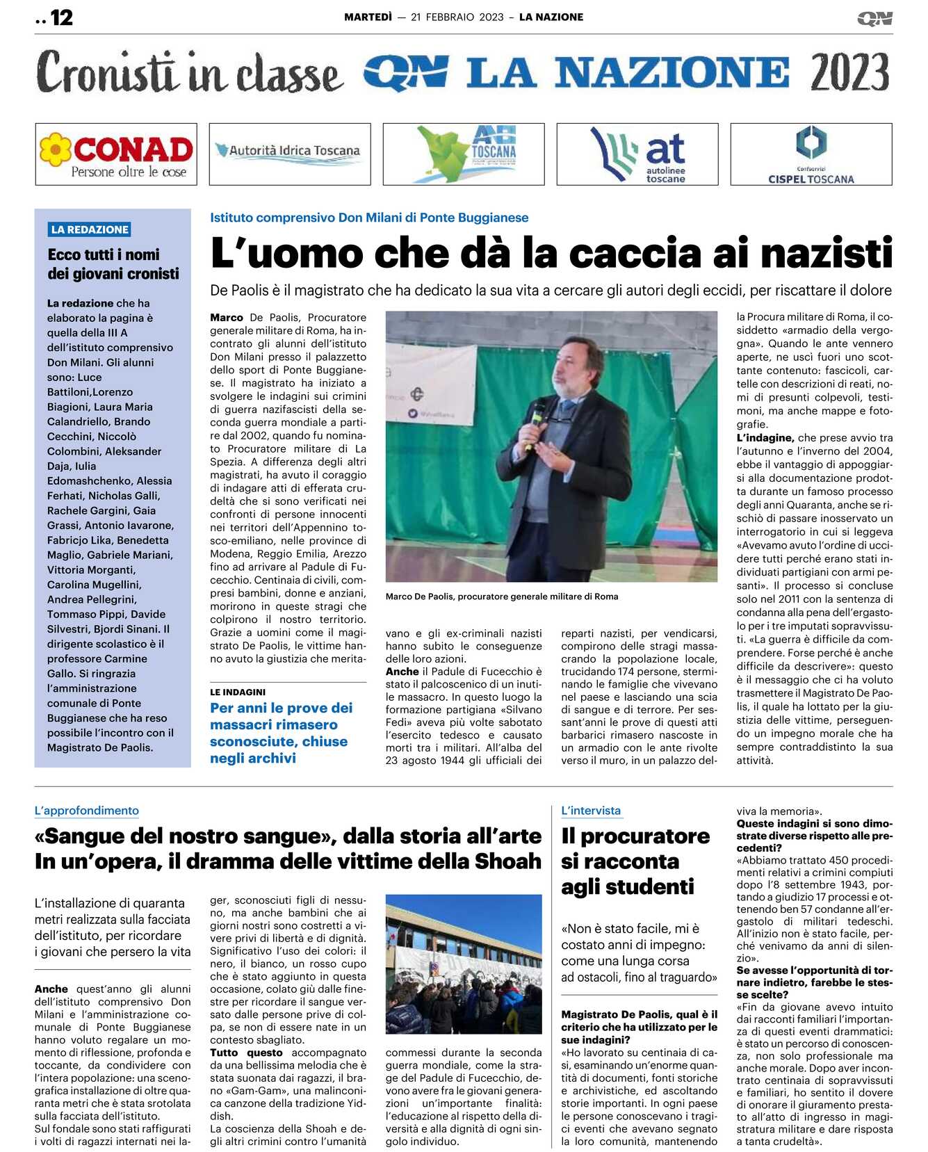 Marco De Paolis, Procuratore generale militare di Roma, ha incontrato gli alunni dell’istituto Don Milani presso il palazzetto dello sport di Ponte Buggianese. Il magistrato ha iniziato a svolgere le indagini sui crimini di guerra nazifascisti della seconda guerra mondiale a partire dal 2002, quando fu nominato Procuratore militare di La Spezia. A differenza degli altri magistrati, ha avuto il coraggio di indagare atti di efferata crudeltà che si sono verificati nei confronti di persone innocenti nei territori dell’Appennino tosco-emiliano, nelle province di Modena, Reggio Emilia, Arezzo fino ad arrivare al Padule di Fucecchio. Centinaia di civili, compresi bambini, donne e anziani, morirono in queste stragi che colpirono il nostro territorio.