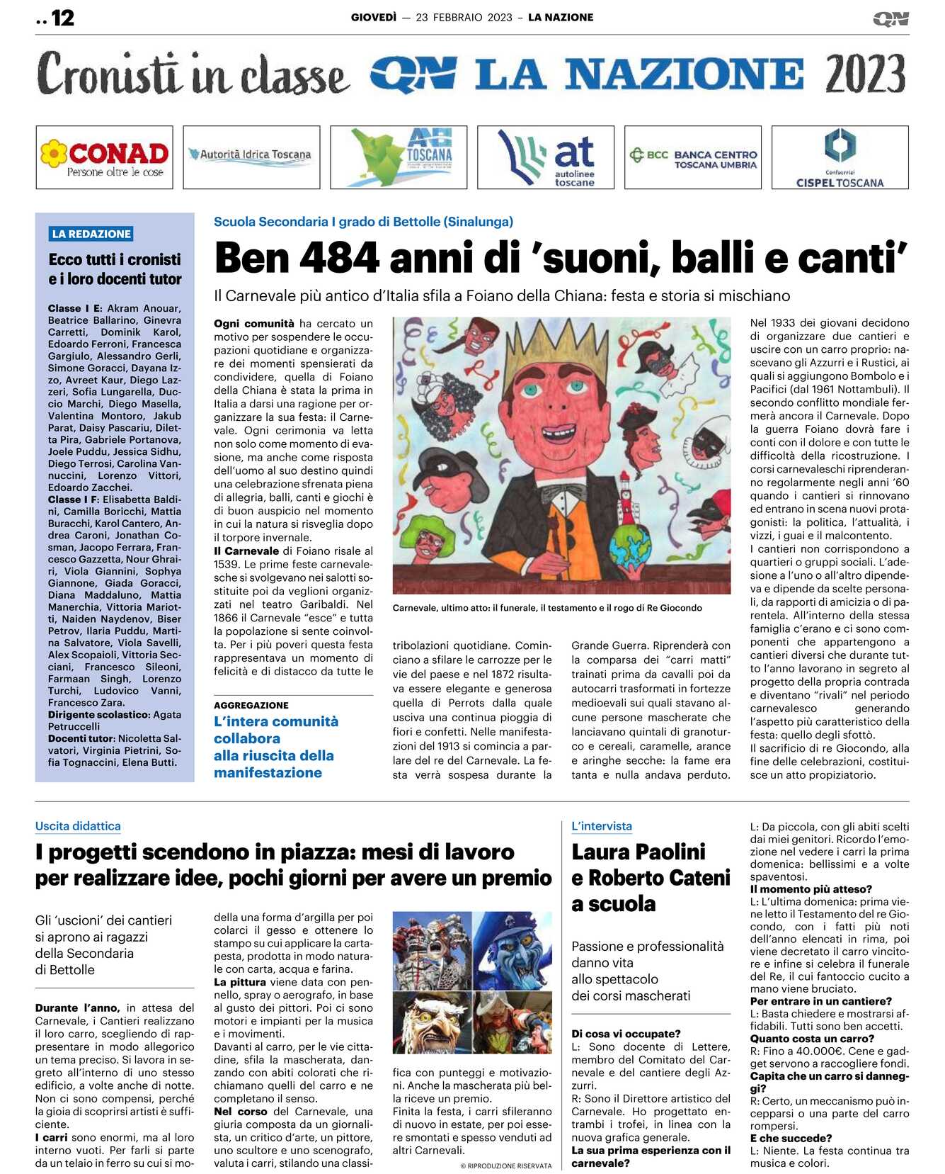 Il Carnevale di Foiano risale al 1539. Le prime feste carnevalesche si svolgevano nei salotti sostituite poi da veglioni organizzati nel teatro Garibaldi. Nel 1866 il Carnevale “esce” e tutta la popolazione si sente coinvolta. Per i più poveri questa festa rappresentava un momento di felicità e di distacco da tutte le tribolazioni quotidiane. Cominciano a sfilare le carrozze per le vie del paese e nel 1872 risultava essere elegante e generosa quella di Perrots dalla quale usciva una continua pioggia di fiori e confetti. Nelle manifestazioni del 1913 si comincia a parlare del re del Carnevale. La festa verrà sospesa durante la Grande Guerra. Riprenderà con la comparsa dei “carri matti” trainati prima da cavalli poi da autocarri trasformati in fortezze medioevali sui quali stavano alcune persone mascherate che lanciavano quintali di granoturco e cereali, caramelle, arance e aringhe secche: la fame era tanta e nulla andava perduto.Nel 1933 dei giovani decidono di organizzare due cantieri e uscire con un carro proprio: nascevano gli Azzurri e i Rustici, ai quali si aggiungono Bombolo e i Pacifici (dal 1961 Nottambuli). Il secondo conflitto mondiale fermerà ancora il Carnevale. Dopo la guerra Foiano dovrà fare i conti con il dolore e con tutte le difficoltà della ricostruzione. I corsi carnevaleschi riprenderanno regolarmente negli anni ’60 quando i cantieri si rinnovano ed entrano in scena nuovi protagonisti: la politica, l’attualità, i vizzi, i guai e il malcontento.
