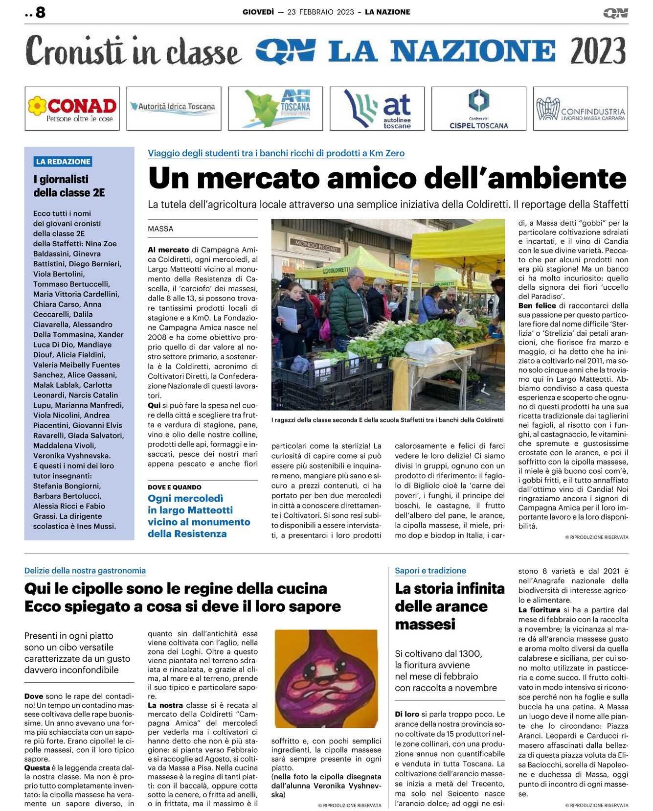 Al mercato di Campagna Amica Coldiretti, ogni mercoledì, al Largo Matteotti vicino al monumento della Resistenza di Cascella, il ‘carciofo’ dei massesi, dalle 8 alle 13, si possono trovare tantissimi prodotti locali di stagione e a Km0. La Fondazione Campagna Amica nasce nel 2008 e ha come obiettivo proprio quello di dar valore al nostro settore primario, a sostenerla è la Coldiretti, acronimo di Coltivatori Diretti, la Confederazione Nazionale di questi lavoratori.