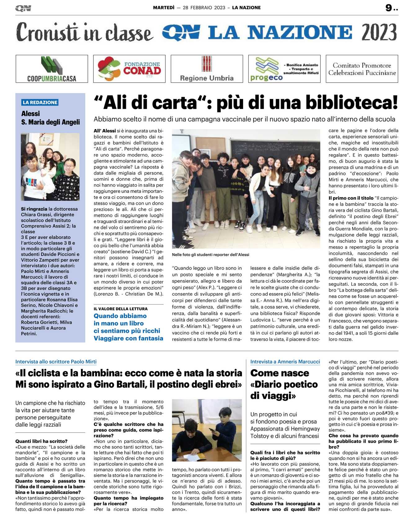 All’ Alessi si è inaugurata una biblioteca. Il nome scelto dai ragazzi e bambini dell’Istituto è “Ali di carta”. Perché paragonare uno spazio moderno, accogliente e stimolante ad una campagna vaccinale? La risposta è data dalle migliaia di persone, uomini e donne che, prima di noi hanno viaggiato in salita per raggiungere una meta importante e ora ci consentono di fare lo stesso viaggio, ma con un dono prezioso: le ali. Ali che ci permettono di raggiungere luoghi e traguardi straordinari e al temine del volo ci sentiremo più ricchi e soprattutto più consapevoli e grati. “Leggere libri è il gioco più bello che l’umanità abbia creato” (sostiene David C.) “I genitori possono insegnarti ad amare, a ridere e correre, ma leggere un libro ci porta a superare i nostri limiti, ci conduce in un mondo diverso in cui poter esprimere le proprie emozioni” (Lorenzo B. – Christian De M.).“Quando leggo un libro sono in un posto speciale e mi sento spensierato, allegro e libero da ogni peso” (Alex P.). “Leggere ci consente di sviluppare gli anticorpi per difenderci dalle tante forme di violenza, dall’indifferenza, dalla banalità e superficialità del quotidiano” (Alessandra R.-Miriam N.); “leggere è un vaccino che ci rende più forti e resistenti a tutte le forme di malessere e dalle insidie delle dipendenze” (Margherita A.); “la lettura ci dà le coordinate per fare le scelte giuste che ci conducono ad essere più felici” (Melissa E.- Anna R.). Ma nell’era digitale, a cosa serve, vi chiederete, una biblioteca fisica? Risponde Ludovica L. “serve perché è un patrimonio culturale, una eredità in cui ci parlano gli autori attraverso la vista, il piacere di toc-care le pagine e l’odore della carta, esperienze sensoriali uniche, magiche ed insostituibili che il mondo della rete non può regalare”. E in questo battesimo, di buon augurio è stata la presenza di una madrina e di un padrino “d’eccezione”: Paolo Mirti e Amneris Marcucci, che hanno presentato i loro ultimi libri.