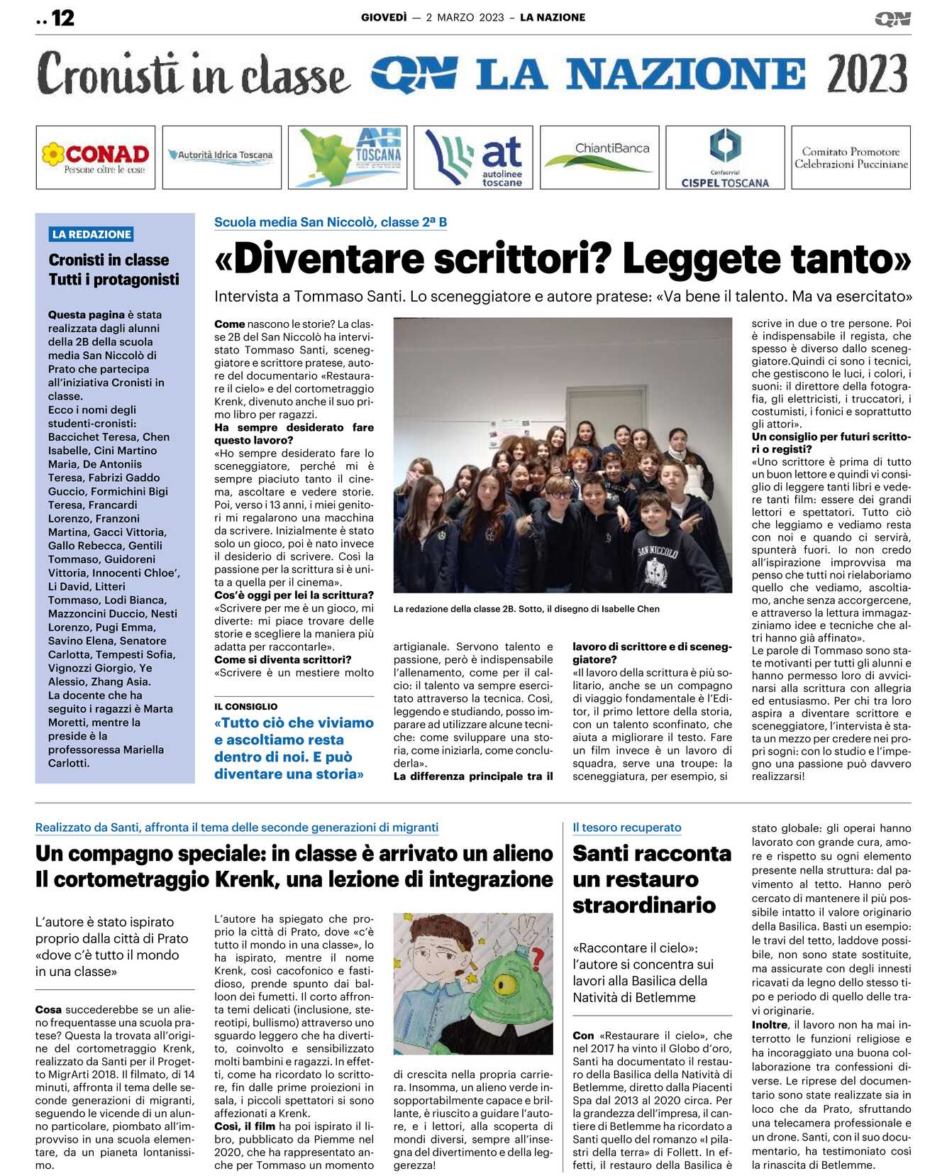 Come nascono le storie? La classe 2B del San Niccolò ha intervistato Tommaso Santi, sceneggiatore e scrittore pratese, autore del documentario «Restaurare il cielo» e del cortometraggio Krenk, divenuto anche il suo primo libro per ragazzi.