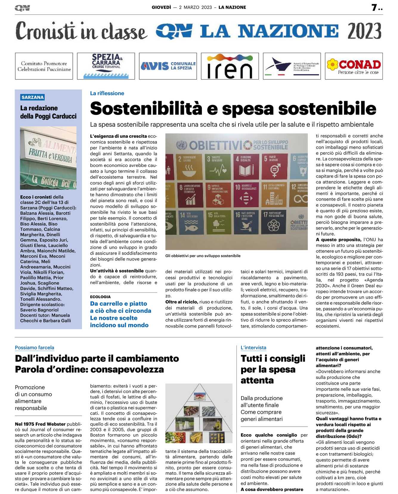 Oltre al riciclo, riuso e riutilizzo dei materiali di produzione, un’attività sostenibile può anche utilizzare fonti di energia rinnovabile come pannelli fotovoltaici e solari termici, impianti di riscaldamento a pavimento, aree verdi, legno e bio-materiali; veicoli elettrici, recupero, trasformazione, smaltimento dei rifiuti, o anche sfruttando il vento, il sole, i corsi d’acqua. Una spesa sostenibile si pone l’obiettivo di ridurre lo spreco alimentare, stimolando comportamenti responsabili e corretti anche nell’acquisto di prodotti locali, con imballaggi meno sofisticati e perciò più difficili da eliminare. La consapevolezza della spesa è sapere cosa si compra e cosa si mangia, perché a volte può capitare di fare la spesa con poca attenzione. Leggere e comprendere le etichette degli alimenti è importante, perché ci consente di fare scelte più sane e consapevoli. Il nostro pianeta è quanto di più prezioso esiste, ma non gode di buona salute, perciò bisogna imparare a preservarlo, anche per le generazioni future.