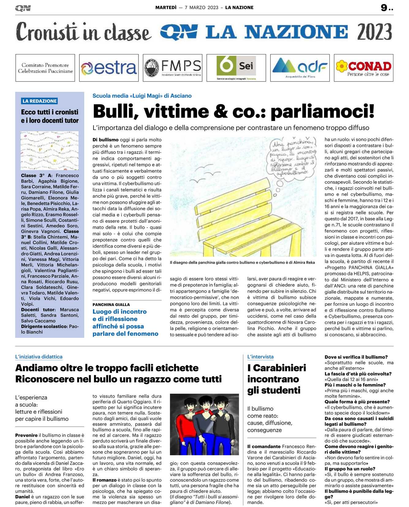 Di bullismo oggi si parla molto perché è un fenomeno sempre più diffuso tra i ragazzi: il termine indica comportamenti aggressivi, ripetuti nel tempo e attuati fisicamente e verbalmente da uno o più soggetti contro una vittima. Il cyberbullismo utilizza i canali telematici e risulta anche più grave, perché le vittime non possono sfuggire agli attacchi data la diffusione dei social media e i cyberbulli pensano di essere protetti dall’anonimato della rete. Il bullo – quasi mai solo – è colui che compie prepotenze contro quelli che identifica come diversi e più deboli, spesso un leader nel gruppo dei pari. Come ci ha detto la psicologa della scuola, i motivi che spingono i bulli ad esser tali possono essere diversi: alcuni riproducono modelli genitoriali negativi, oppure esprimono il disagio di essere loro stessi vittime di prepotenze in famiglia; altri appartengono a famiglie ’democratico-permissive’, che non pongono loro dei limiti. La vittima è percepita come diversa dal resto del gruppo, per timidezza, provenienza, colore della pelle, religione o orientamento sessuale e può tendere ad isolarsi, aver paura di reagire e vergognarsi di chiedere aiuto, finendo per subire in silenzio. Chi è vittima di bullismo subisce conseguenze psicologiche negative e può, a volte, arrivare ad uccidersi, come nel caso della quattordicenne di Novara Carolina Picchio. Anche il gruppo che assiste agli atti di bullismo ha un ruolo: vi sono pochi difensori disposti a contrastare i bulli, alcuni gregari che partecipano agli atti, dei sostenitori che li rinforzano mostrando di apprezzarli e molti spettatori passivi, che diventano così complici inconsapevoli. Secondo le statistiche, i ragazzi coinvolti nel bullismo e nel cyberbullismo, maschi e femmine, hanno tra i 12 e i 16 anni e la maggioranza dei casi si registra nelle scuole. Per questo dal 2017, in base alla Legge n.71, le scuole contrastano il fenomeno con progetti, riflessioni in classe e incontri con psicologi, per aiutare vittime e bulli e rendere il gruppo parte attiva in questa lotta. Al di fuori della scuola, è partito di recente il «Progetto PANCHINA GIALLA» promosso da HELPIS, patrocinato dal Ministero dell’Interno e dall’ANCI: una rete di panchine gialle distribuite sul territorio nazionale, mappate e numerate, per fornire un luogo di incontro e di riflessione contro Bullismo e Cyberbullismo, presenza concreta per i ragazzi e tra i ragazzi, perché bulli e vittime si parlino, si conoscano, si abbraccino.