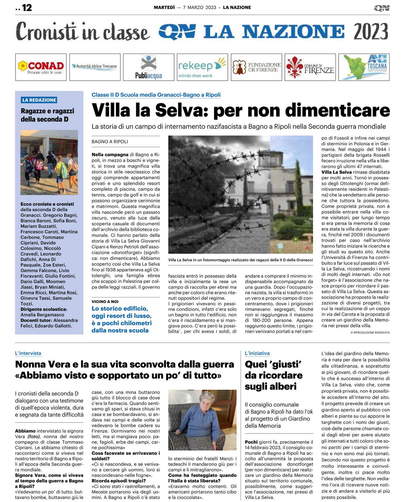Nella campagna di Bagno a Ripoli, in mezzo a boschi e vigneti, si trova una magnifica villa storica in stile neoclassico che oggi comprende appartamenti privati e uno splendido resort completo di piscina, campo da tennis, campo da golf e in cui si possono organizzare cerimonie e matrimoni. Questa magnifica villa nasconde però un passato oscuro, venuto alla luce dalla scoperta casuale di documenti dell’archivio della biblioteca comunale. Ci hanno parlato della storia di Villa La Selva Giovanni Cipani e Renzo Petrioli dell’associazione «donotforget» (significa: non dimenticare). Abbiamo scoperto così che Villa La Selva fino al 1938 apparteneva agli Ottolenghi, una famiglia ebrea che scappò in Palestina per colpa delle leggi razziali. Il governo fascista entrò in possesso della villa e inizialmente la rese un campo di raccolta per ebrei ma anche per coloro che erano ritenuti oppositori del regime.