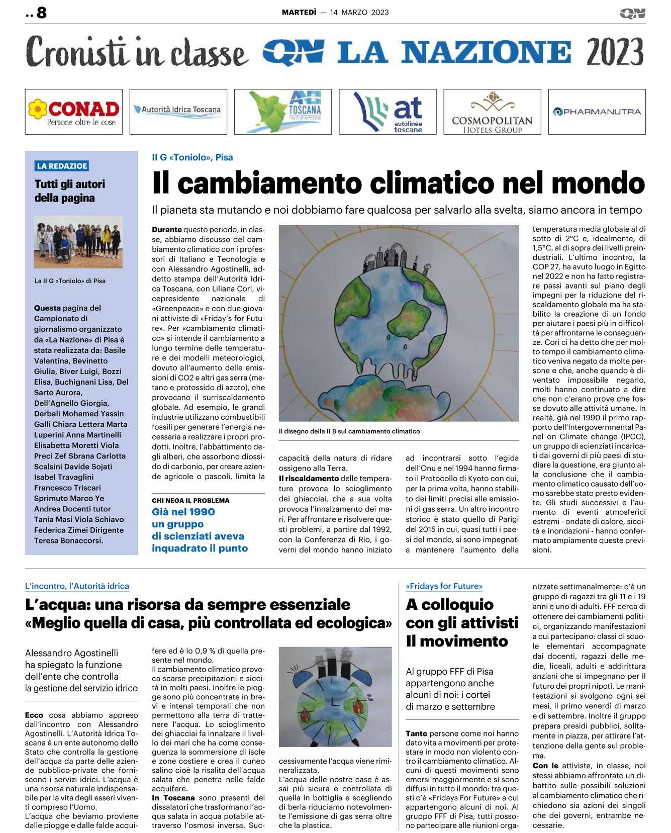 Durante questo periodo, in classe, abbiamo discusso del cambiamento climatico con i professori di Italiano e Tecnologia e con Alessandro Agostinelli, addetto stampa dell’Autorità Idrica Toscana, con Liliana Cori, vicepresidente nazionale di «Greenpeace» e con due giovani attiviste di «Friday’s for Future». Per «cambiamento climatico» si intende il cambiamento a lungo termine delle temperature e dei modelli meteorologici, dovuto all’aumento delle emissioni di CO2 e altri gas serra (metano e protossido di azoto), che provocano il surriscaldamento globale. Ad esempio, le grandi industrie utilizzano combustibili fossili per generare l’energia necessaria a realizzare i propri prodotti. Inoltre, l’abbattimento degli alberi, che assorbono diossido di carbonio, per creare aziende agricole o pascoli, limita la capacità della natura di ridare ossigeno alla Terra.