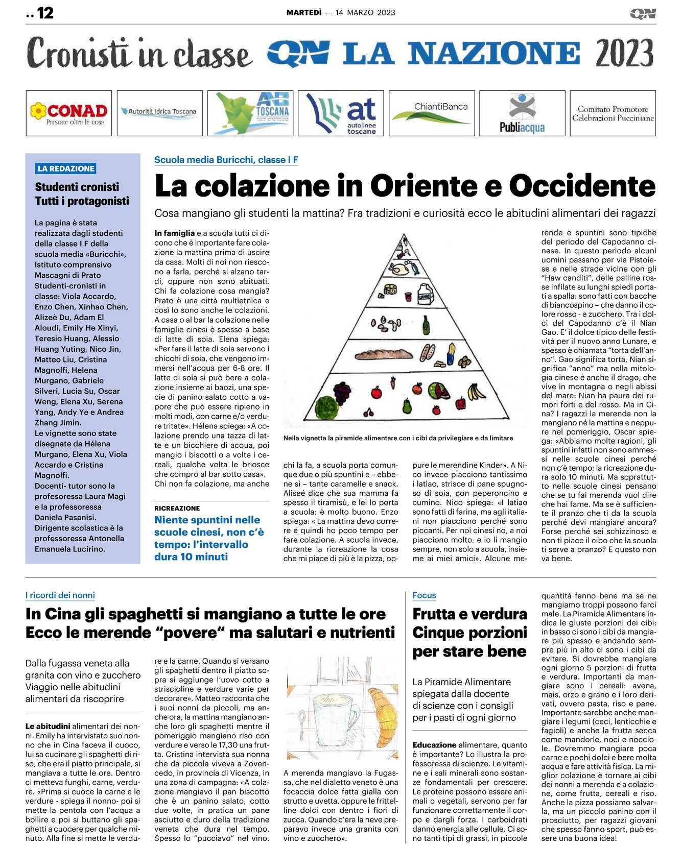 Aliseé dice che sua mamma fa spesso il tiramisù, e lei lo porta a scuola: è molto buono. Enzo spiega: « La mattina devo correre e quindi ho poco tempo per fare colazione. A scuola invece, durante la ricreazione la cosa che mi piace di più è la pizza, op-pure le merendine Kinder». A Nico invece piacciono tantissimo i latìao, strisce di pane spugnoso di soia, con peperoncino e cumino. Nico spiega: «I latìao sono fatti di farina, ma agli italiani non piacciono perché sono piccanti. Per noi cinesi no, a noi piacciono molto, e io li mangio sempre, non solo a scuola, insieme ai miei amici». Alcune me-rende e spuntini sono tipiche del periodo del Capodanno cinese. In questo periodo alcuni uomini passano per via Pistoiese e nelle strade vicine con gli “Haw canditi”, delle palline rosse infilate su lunghi spiedi portati a spalla: sono fatti con bacche di biancospino – che danno il colore rosso – e zucchero. Tra i dolci del Capodanno c’è il Nian Gao. E’ il dolce tipico delle festività per il nuovo anno Lunare, e spesso è chiamata “torta dell’anno”. Gao significa torta, Nian significa “anno” ma nella mitologia cinese è anche il drago, che vive in montagna o negli abissi del mare: Nian ha paura dei rumori forti e del rosso. Ma in Cina? I ragazzi la merenda non la mangiano né la mattina e neppure nel pomeriggio, Oscar spiega: «Abbiamo molte ragioni, gli spuntini infatti non sono ammessi nelle scuole cinesi perché non c’è tempo: la ricreazione dura solo 10 minuti. Ma soprattutto nelle scuole cinesi pensano che se tu fai merenda vuol dire che hai fame. Ma se è sufficiente il pranzo che ti da la scuola perché devi mangiare ancora? Forse perché sei schizzinoso e non ti piace il cibo che la scuola ti serve a pranzo? E questo non va bene.