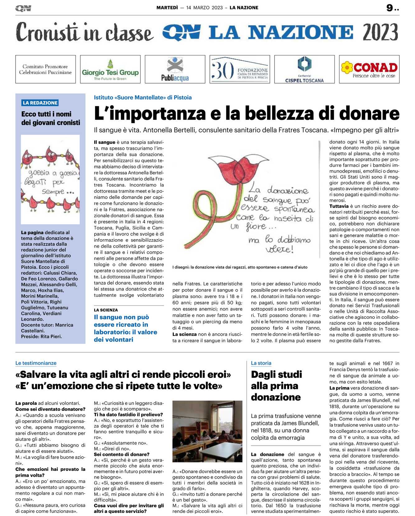 Per sensibilizzarci su questo tema abbiamo deciso di intervistare la dottoressa Antonella Bertelli, consulente sanitario della Fratres Toscana. Incontriamo la dottoressa tramite meet e le poniamo delle domande per capire come funzionano le donazioni e la Fratres, associazione nazionale donatori di sangue. Essa è presente in Italia in 4 regioni: Toscana, Puglia, Sicilia e Campania e il lavoro che svolge è di informazione e sensibilizzazione della collettività per garantire il sangue e i relativi componenti alle persone affette da patologie o che devono essere operate o soccorse per incidente. La dottoressa illustra l’importanza del donare, essendo stata lei stessa una donatrice che attualmente svolge volontariato nella Fratres. Le caratteristiche per poter donare il sangue o il plasma sono: avere tra i 18 e i 60 anni; pesare più di 50 kg; non essere anemici; non avere malattie e non aver fatto un tatuaggio o un piercing da meno di 4 mesi.