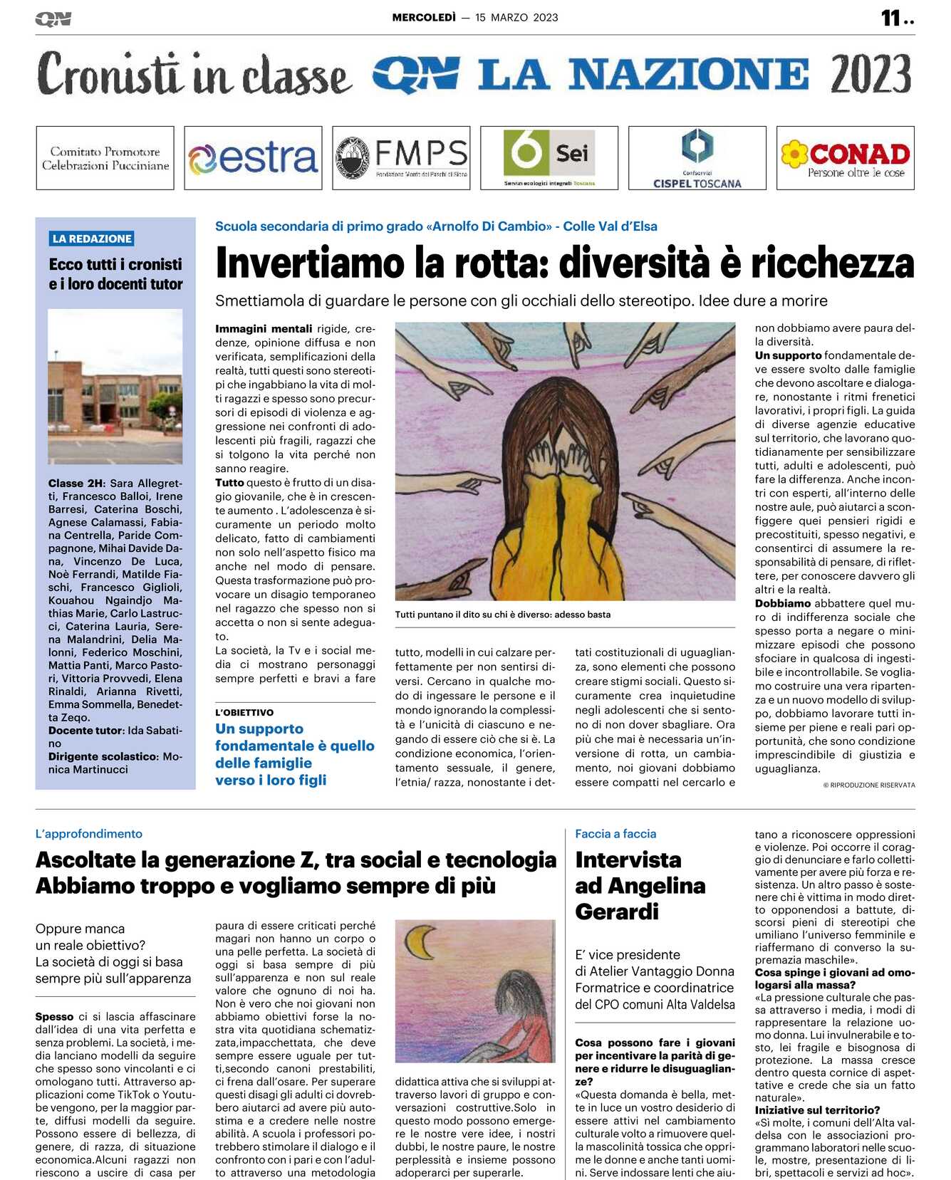 Iniziative sul territorio? «Sì molte, i comuni dell’Alta Valdelsa con le associazioni programmano laboratori nelle scuole, mostre, presentazione di libri, spettacoli e servizi ad hoc». Classe 2H: Sara Allegretti, Francesco Balloi, Irene Barresi, Caterina Boschi, Agnese Calamassi, Fabiana Centrella, Paride Compagnone, Mihai Davide Dana, Vincenzo De Luca, Noè Ferrandi, Matilde Fiaschi, Francesco Giglioli, Kouahou Ngaindjo Mathias Marie, Carlo Lastrucci, Caterina Lauria, Serena Malandrini, Delia Malonni, Federico Moschini, Mattia Panti, Marco Pastori, Vittoria Provvedi, Elena Rinaldi, Arianna Rivetti, Emma Sommella, Benedetta Zeqo.