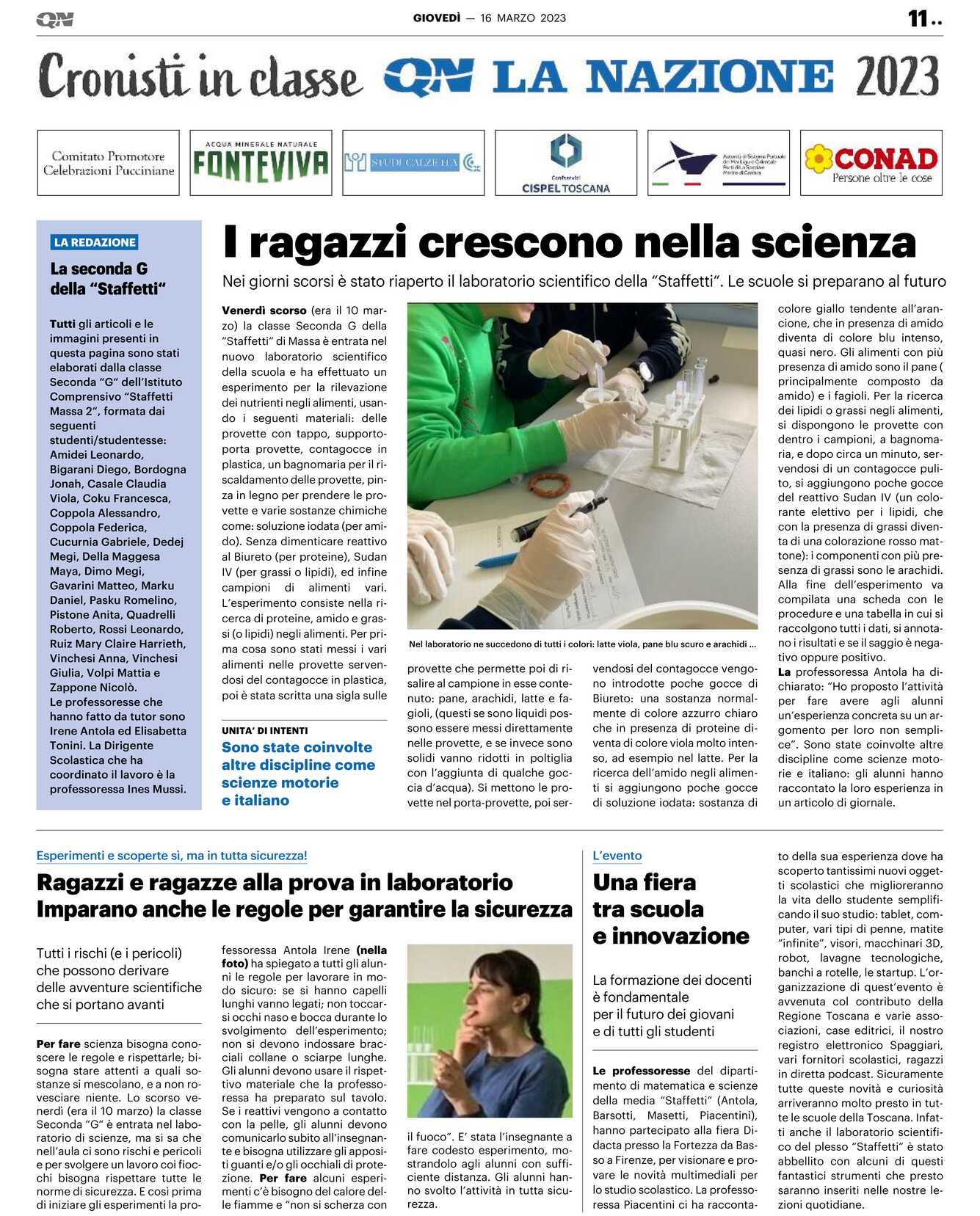 Se i reattivi vengono a contatto con la pelle, gli alunni devono comunicarlo subito all’insegnante e bisogna utilizzare gli appositi guanti e/o gli occhiali di protezione. Per fare alcuni esperimenti c’è bisogno del calore delle fiamme e “non si scherza con il fuoco”. E’ stata l’insegnante a fare codesto esperimento, mostrandolo agli alunni con sufficiente distanza. Gli alunni hanno svolto l’attività in tutta sicurezza. Le professoresse del dipartimento di matematica e scienze della media “Staffetti“ (Antola, Barsotti, Masetti, Piacentini),hanno partecipato alla fiera Didacta presso la Fortezza da Basso a Firenze, per visionare e provare le novità multimediali per lo studio scolastico. La professoressa Piacentini ci ha racconta-to della sua esperienza dove ha scoperto tantissimi nuovi oggetti scolastici che miglioreranno la vita dello studente semplificando il suo studio: tablet, computer, vari tipi di penne, matite “infinite”, visori, macchinari 3D, robot, lavagne tecnologiche, banchi a rotelle, le startup. L’organizzazione di quest’evento è avvenuta col contributo della Regione Toscana e varie associazioni, case editrici, il nostro registro elettronico Spaggiari, vari fornitori scolastici, ragazzi in diretta podcast. Sicuramente tutte queste novità e curiosità arriveranno molto presto in tutte le scuole della Toscana. Infatti anche il laboratorio scientifico del plesso “Staffetti“ è stato abbellito con alcuni di questi fantastici strumenti che presto saranno inseriti nelle nostre lezioni quotidiane. Tutti gli articoli e le immagini presenti in questa pagina sono stati elaborati dalla classe Seconda “G“ dell’Istituto Comprensivo “Staffetti Massa 2“, formata dai seguenti studenti/studentesse: Amidei Leonardo, Bigarani Diego, Bordogna Jonah, Casale Claudia Viola, Coku Francesca, Coppola Alessandro, Coppola Federica, Cucurnia Gabriele, Dedej Megi, Della Maggesa Maya, Dimo Megi, Gavarini Matteo, Marku Daniel, Pasku Romelino, Pistone Anita, Quadrelli Roberto, Rossi Leonardo, Ruiz Mary Claire Harrieth, Vinchesi Anna, Vinchesi Giulia, Volpi Mattia e Zappone Nicolò.