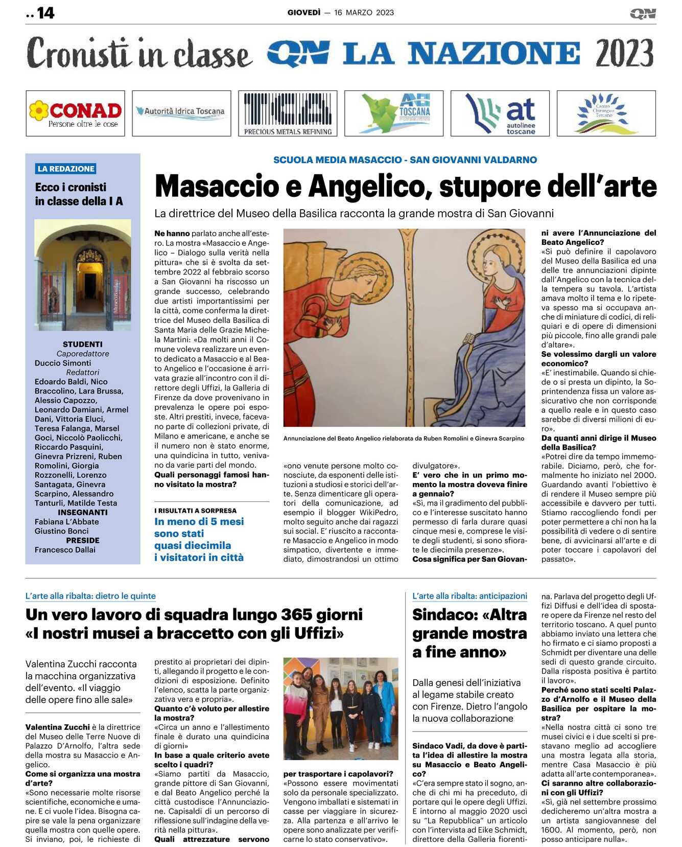 Quali personaggi famosi hanno visitato la mostra?«ono venute persone molto conosciute, da esponenti delle istituzioni a studiosi e storici dell’arte. Senza dimenticare gli operatori della comunicazione, ad esempio il blogger WikiPedro, molto seguito anche dai ragazzi sui social. E’ riuscito a raccontare Masaccio e Angelico in modo simpatico, divertente e immediato, dimostrandosi un ottimo divulgatore».