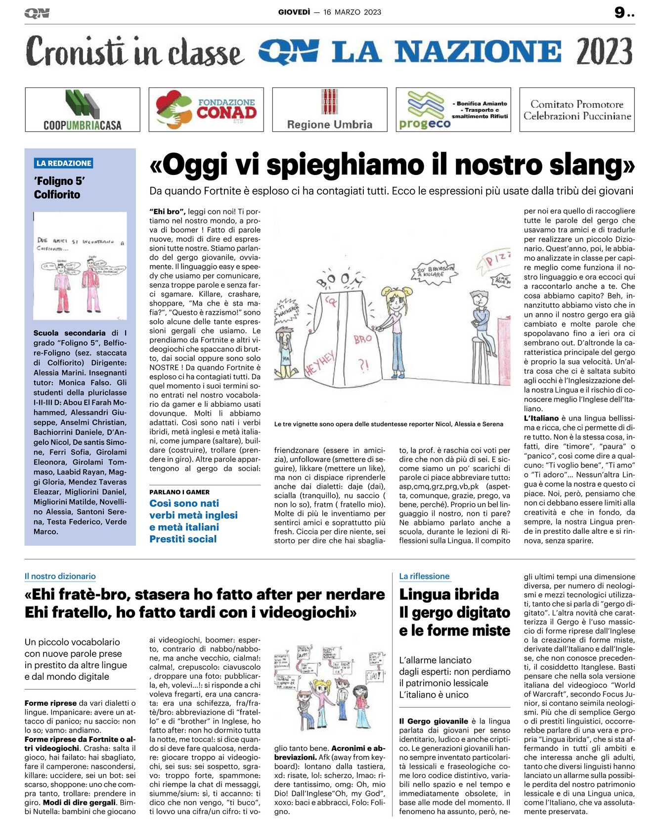 Forme riprese da Fortnite o altri videogiochi. Crasha: salta il gioco, hai failato: hai sbagliato, fare il camperone: nascondersi, killare: uccidere, sei un bot: sei scarso, shoppone: uno che compra tanto, trollare: prendere in giro. Modi di dire gergali. Bimbi Nutella: bambini che giocano ai videogiochi, boomer: esperto, contrario di nabbo/nabbone, ma anche vecchio, cialma!: calma!, crepuscolo: ciavuscolo , droppare una foto: pubblicarla, eh, volevi…!: si risponde a chi voleva fregarti, era una cancrata: era una schifezza, fra/fratè/bro: abbreviazione di “fratello” e di “brother” in Inglese, ho fatto after: non ho dormito tutta la notte, me tocca!: si dice quando si deve fare qualcosa, nerdare: giocare troppo ai videogiochi, sei sus: sei sospetto, sgravo: troppo forte, spammone: chi riempie la chat di messaggi, siumme/sium: sì, ti accanno: ti dico che non vengo, “ti buco“, ti lovvo una cifra/un cifro: ti voglio tanto bene. Acronimi e abbreviazioni. Afk (away from keyboard): lontano dalla tastiera, xd: risate, lol: scherzo, lmao: ridere tantissimo, omg: Oh, mio Dio! Dall’Inglese”Oh, my God”, xoxo: baci e abbracci, Folo: Foligno. Il Gergo giovanile è la lingua parlata dai giovani per senso identitario, ludico e anche criptico. Le generazioni giovanili hanno sempre inventato particolarità lessicali e fraseologiche come loro codice distintivo, variabili nello spazio e nel tempo e immediatamente obsolete, in base alle mode del momento. Il fenomeno ha assunto, però, ne-gli ultimi tempi una dimensione diversa, per numero di neologismi e mezzi tecnologici utilizzati, tanto che si parla di “gergo digitato”. L’altra novità che caratterizza il Gergo è l’uso massiccio di forme riprese dall’Inglese o la creazione di forme miste, derivate dall’Italiano e dall’Inglese, che non conosce precedenti, il cosiddetto Itanglese. Basti pensare che nella sola versione italiana del videogioco “World of Warcraft”, secondo Focus Junior, si contano seimila neologismi. Più che di semplice Gergo o di prestiti linguistici, occorrerebbe parlare di una vera e propria “Lingua ibrida”, che si sta affermando in tutti gli ambiti e che interessa anche gli adulti, tanto che diversi linguisti hanno lanciato un allarme sulla possibile perdita del nostro patrimonio lessicale e di una Lingua unica, come l’Italiano, che va assolutamente preservata. Scuola secondaria di I grado “Foligno 5”, Belfiore-Foligno (sez. staccata di Colfiorito) Dirigente: Alessia Marini. Insegnanti tutor: Monica Falso. Gli studenti della pluriclasse I-II-III D: Abou El Farah Mohammed, Alessandri Giuseppe, Anselmi Christian, Bachiorrini Daniele, D’Angelo Nicol, De santis Simone, Ferri Sofia, Girolami Eleonora, Girolami Tommaso, Laabid Rayan, Maggi Gloria, Mendez Taveras Eleazar, Migliorini Daniel, Migliorini Matilde, Novellino Alessia, Santoni Serena, Testa Federico, Verde Marco. LA REDAZIONE