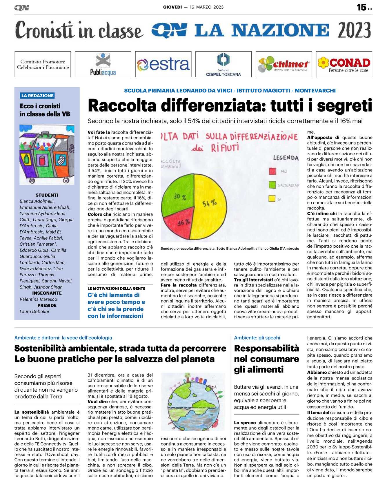 Il tema del consumo e della produzione responsabile di cibo e risorse è così importante che l’Onu ha deciso di inserirlo come obiettivo da raggiungere, a livello mondiale, nell’Agenda 2030 per lo Sviluppo Sostenibile. «Forse – abbiamo riflettuto se iniziassimo a non buttare il cibo, mangiando tutto quello che ci viene dato, il mondo sarebbe un posto migliore». STUDENTI Bianca Adolmelli, Emmanuel Akhere Efuah, Yasmine Aydani, Elena Ciatti, Laura Dago, Giorgia D’Ambrosio, Giulia D’Ambrosio, Majd Et Tayea, Achille Fabbri, Cristian Farnetani, Edoardo Gioia, Camilla Guarducci, Giulia Lombardi, Carlos Mao, Deurys Mendez, Cloe Peruzzo, Thomas Pianigiani, Sandhu Navtej Singh, Jasnoor Singh INSEGNANTE Valentina Marasco PRESIDE Laura Debolini LA REDAZIONE