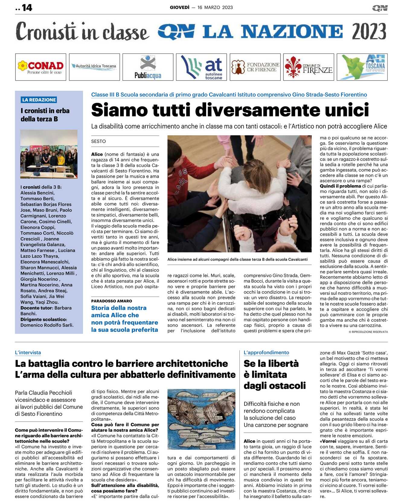 Il viaggio della scuola media però sta per terminare. Ci siamo divertiti tanto in questi tre anni, ma è giunto il momento di fare un passo avanti molto importante: andare alle superiori. Tutti abbiamo già fatto la nostra scelta: c’è chi andrà allo scientifico, chi al linguistico, chi al classico e chi allo sportivo, ma la scuola che è stata pensata per Alice, il Liceo Artistico, non può ospita-re ragazzi come lei. Muri, scale, ascensori rotti e porte strette sono vere e proprie barriere per chi è diversamente abile. L’accesso alla scuola non prevede una rampa per chi è in carrozzina, non ci sono bagni dedicati ai disabili, molti laboratori si trovano nel seminterrato ma non ci sono ascensori. La referente per l’inclusione dell’istituto comprensivo Gino Strada, Gemma Bocci, durante la visita a questa scuola ha visto con i propri occhi la condizione in cui si trova: un vero disastro. La responsabile del sostegno della scuola superiore con cui ha parlato, le ha detto che quel plesso non ha mai ospitato persone con handicap fisici, proprio a causa di questi problemi e spera che prima o poi qualcuno se ne accorga. Se osserviamo la questione più da vicino, il problema riguarda tutta la popolazione scolastica: se un ragazzo è costretto sulla sedia a rotelle perché ha una gamba ingessata, come può accedere alla classe se non c’è un ascensore o una rampa? Quindi il problema di cui parliamo riguarda tutti, non solo i diversamente abili. Per questo Alice sarà costretta forse a passare un altro anno alla scuola media ma noi vogliamo farci sentire e vogliamo che qualcuno si renda conto che ci sono edifici pubblici non a norma e non accessibili a tutti. La scuola deve essere inclusiva e ognuno deve avere la possibilità di frequentarla. Alice ha gli stessi diritti di tutti. Nessuna condizione di disabilità può essere causa di esclusione dalla scuola. A sentirne parlare sembra quasi irreale.