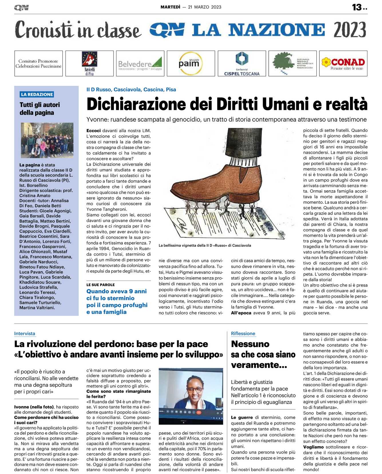 Eccoci davanti alla nostra LIM. L’emozione ci coinvolge tutti, cosa ci narrerà la zia della nostra compagna di classe che tanto caldamente ci ha invitato a conoscere e ascoltare? La Dichiarazione universale dei diritti umani studiata e approfondita sui libri scolastici ci ha portato a farci tante domande e concludere che i diritti umani «sono qualcosa che non può essere ignorato da nessuno» siamo curiosi di conoscere zia Yvonne Tangheroni. Siamo collegati con lei, eccoci davanti una giovane donna che ci saluta e ci ringrazia per il nostro invito, per aver avuto la curiosità di conoscere la sua profonda e fortissima esperienza. 7 aprile 1994, Genocidio in Ruanda contro i Tutsi, sterminio di più di un milione di persone voluto e manovrato da colonizzatori espulsi da parte degli Hutu, etnie diverse ma con una convivenza pacifica fino ad allora. Tutsi, Hutu e Pigmei avevano vissuto benissimo insieme senza problemi di nessun tipo, ma con un popolo diviso è più facile agire, così manovrati e raggirati psicologicamente, incentivato l’odio verso i Tutsi, gli Hutu sterminano tutti coloro che riescono: vicini di casa amici da tempo, nessuno deve rimanere in vita, nessuno doveva raccontare. Sono stati giorni da aprile a luglio di pura paura: un gruppo scappava, un altro uccideva… non è facile immaginare…. Nella categoria che doveva estinguersi c’era la famiglia di Yvonne. All’epoca aveva 9 anni, la più piccola di sette fratelli. Quando fu deciso il giorno dello sterminio per genitori e ragazzi maggiori di 16 anni era impossibile nascondersi. La mamma decise di allontanare i figli più piccoli per poterli salvare e da quel momento non li ha più visti. A 9 anni si è trovata da sola in Congo in un campo profughi dove era arrivata camminando senza meta. Ormai senza famiglia accettava la morte aspettandone il momento. La sua storia però finisce bene. Qualcuno andrà a cercarla grazie ad una lettera da lei spedita. Verrà in Italia adottata dai parenti di Chiara, la nostra compagna di classe e da quel momento la vita prenderà un’altra piega. Per Yvonne la vissuta tragedia e la fortuna di aver trovato una famiglia e ricostruito la vita non le fa dimenticare l’obiettivo di raccontare ad altri ciò che è accaduto perché non si ripeta. L’uomo dovrebbe imparare dalla storia! Un altro obiettivo che si è presa è quello di continuare ad aiutare per quanto possibile le persone in Ruanda, una goccia nel mare – lei dice – ma anche una goccia serve.